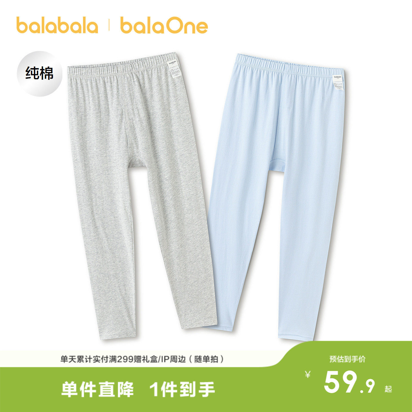 巴拉巴拉男童打底裤春季新款儿童睡裤纯棉中大童保暖裤亲肤两条装
