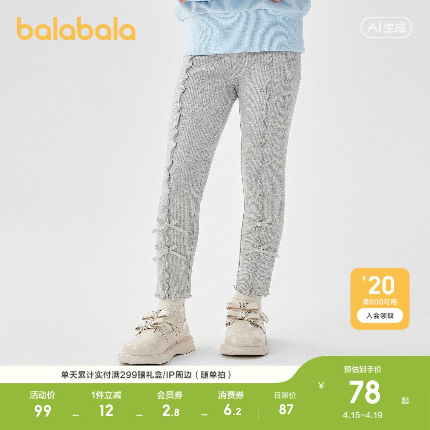 【商场同款】巴拉巴拉童装儿童打底裤女童2026新款春秋弹力保暖裤