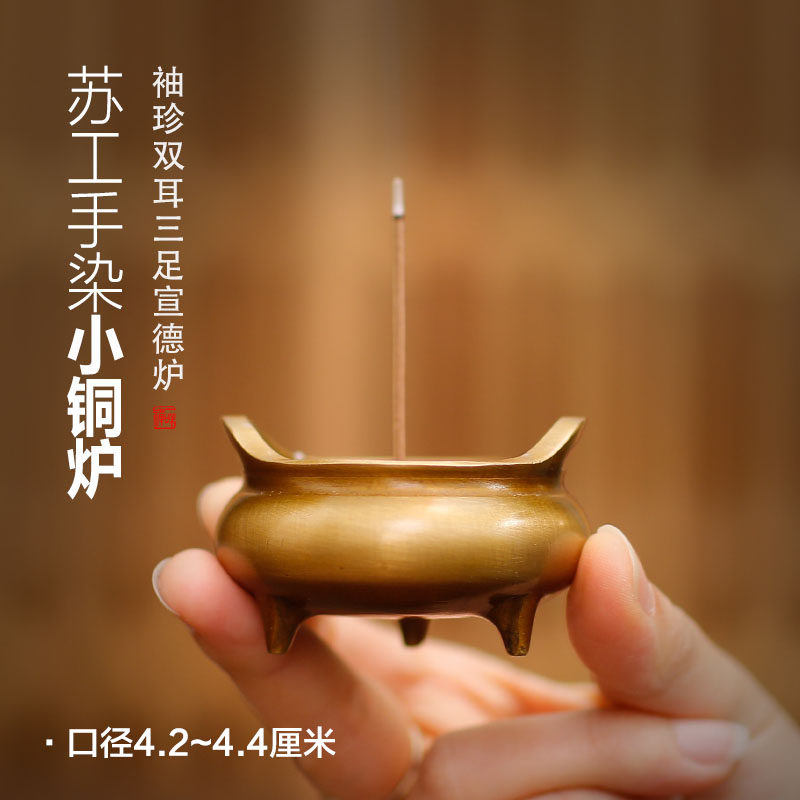功德坊苏工手染香炉纯黄铜家用室内袖珍檀香炉小号烧香线香炉香插