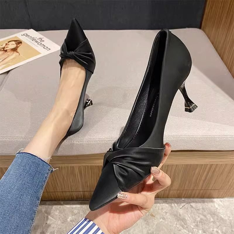 法式尖头浅口细跟小跟3cm中跟5厘米蝴蝶结高跟鞋春秋单鞋配裙子