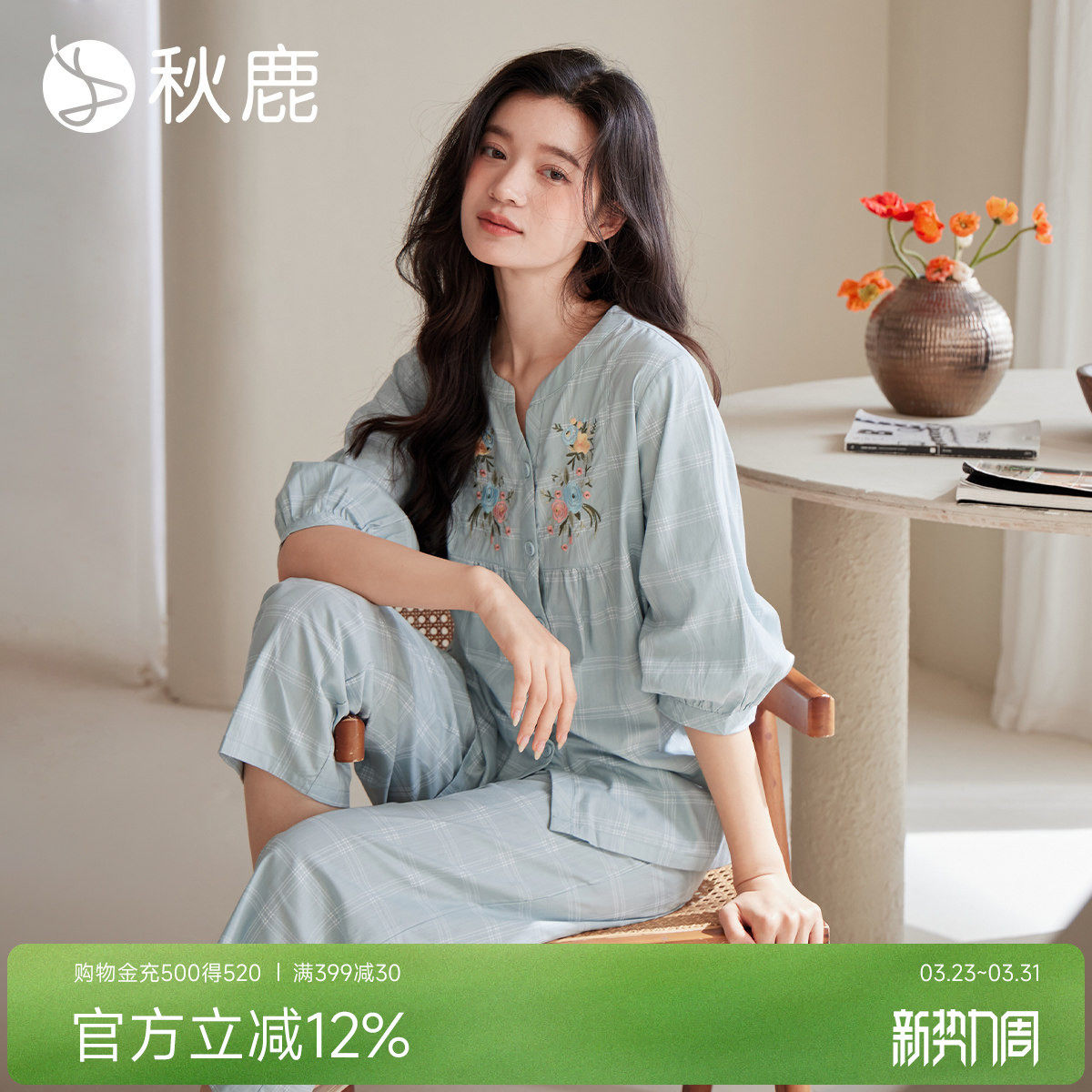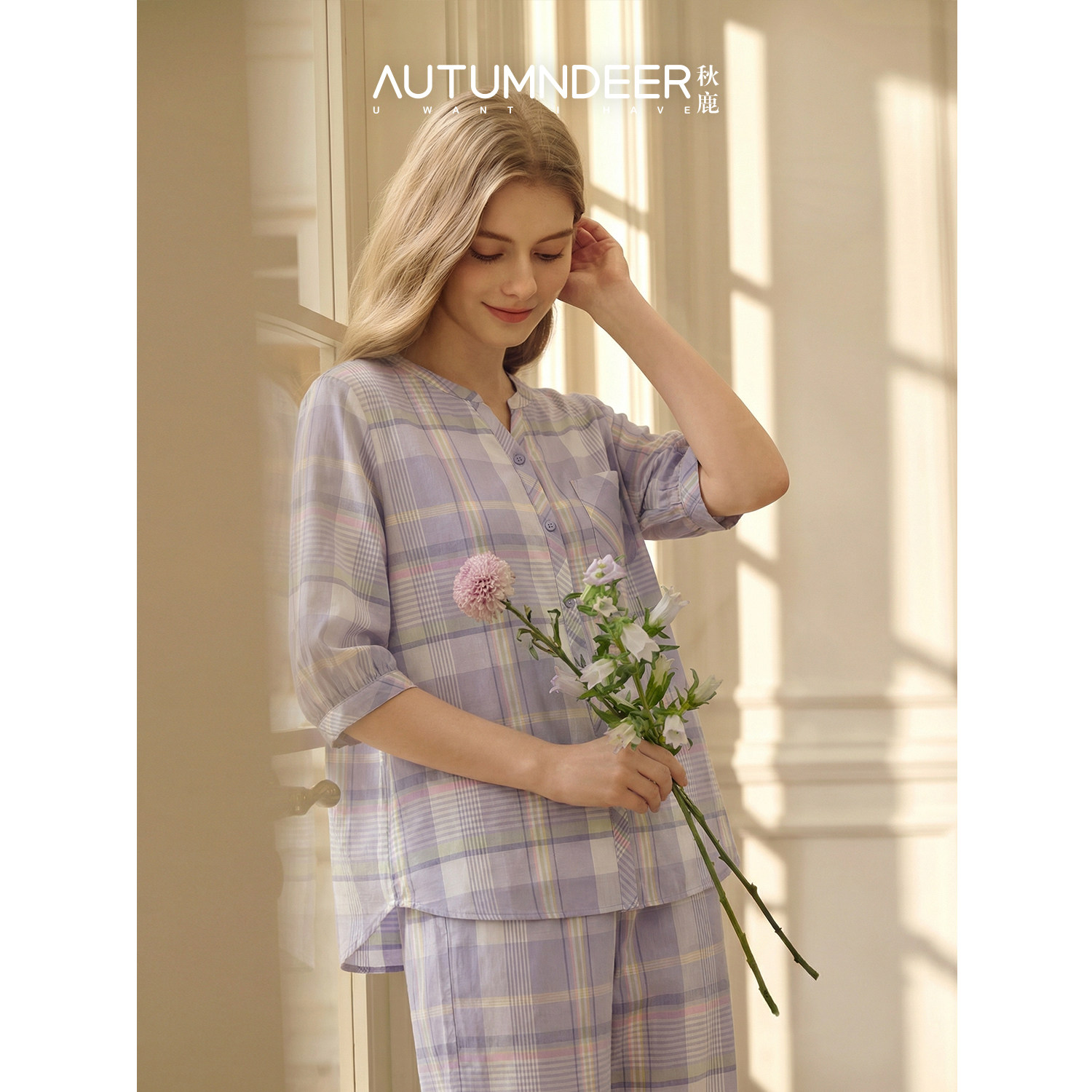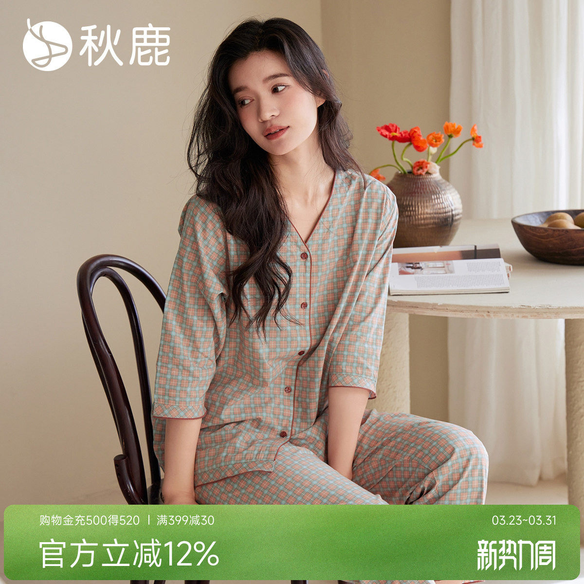 秋鹿轻盈透气抗皱梭织棉睡衣女士格子七分袖2026新款家居服套装