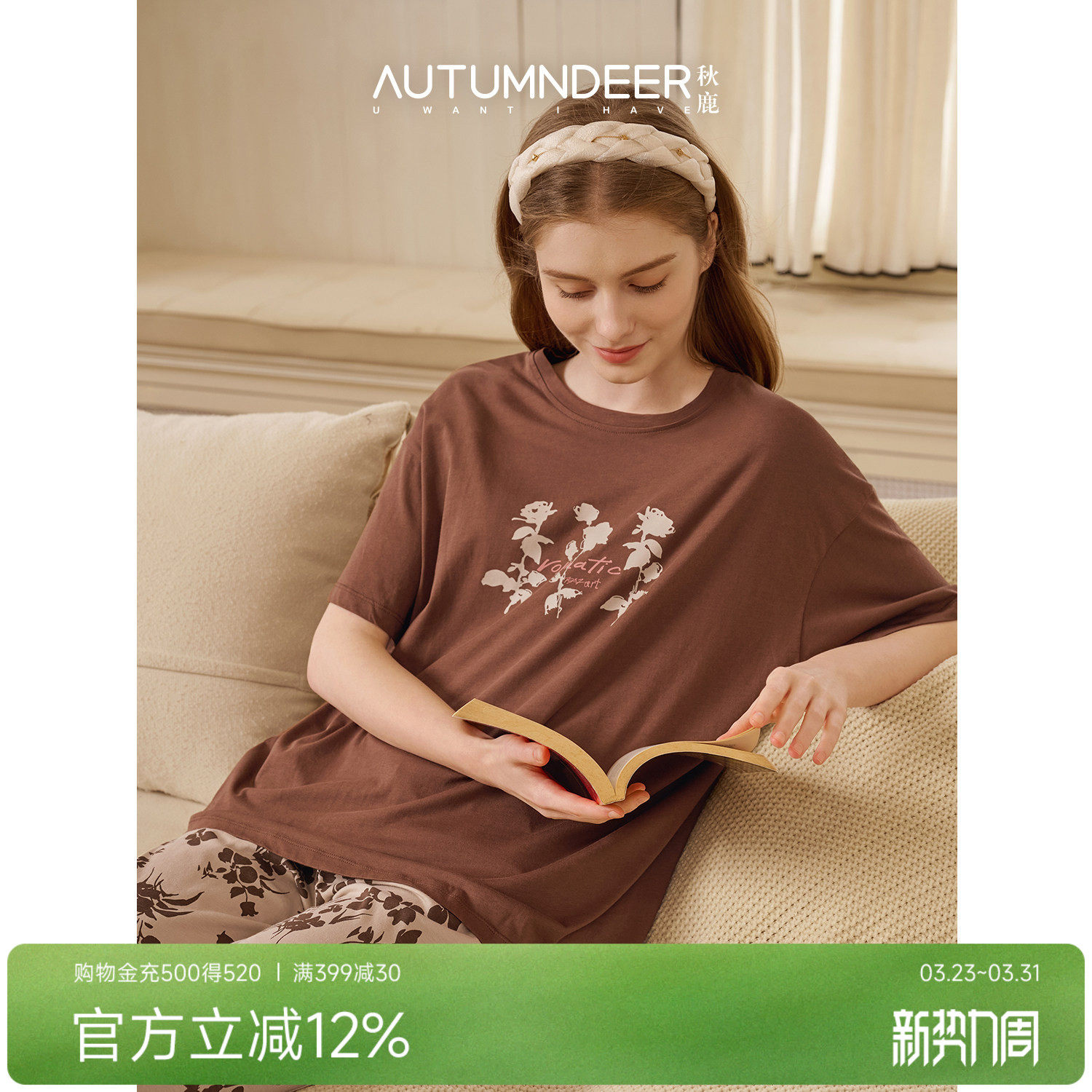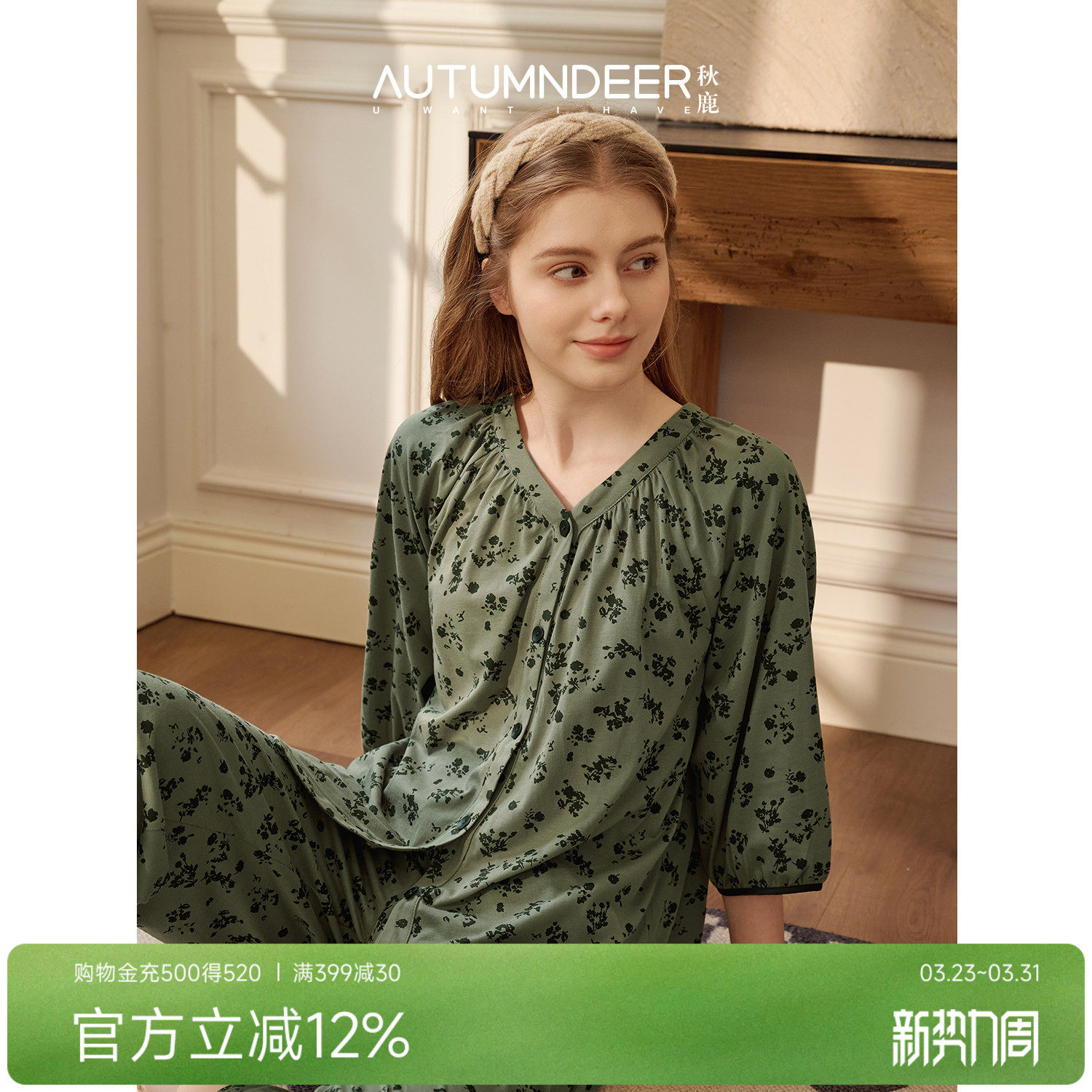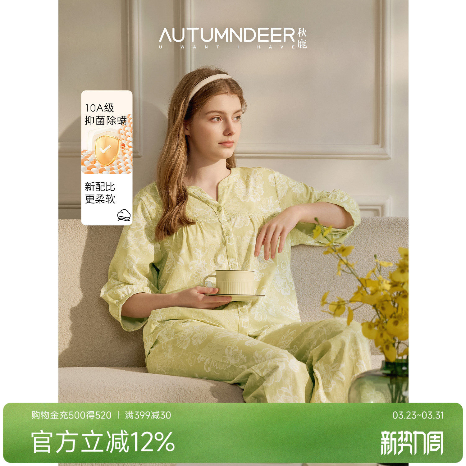 秋鹿纯棉睡衣女士10A抗菌圆领印花绝美七分袖2026春新款家居服