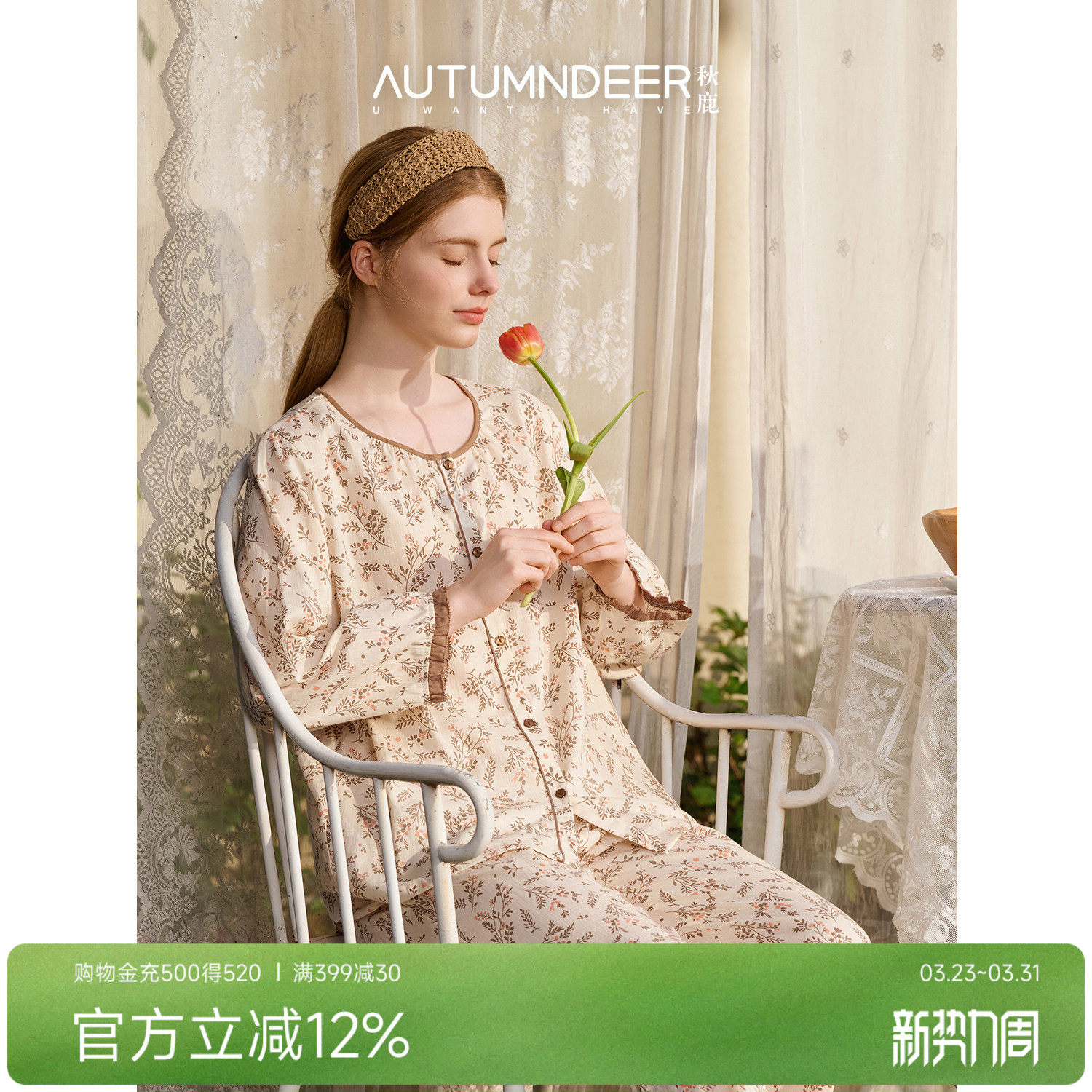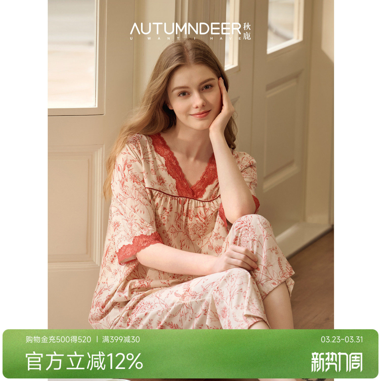 秋鹿纯棉睡衣女士圆领花边袖口印花绝美九分袖长裤2026新款家居服