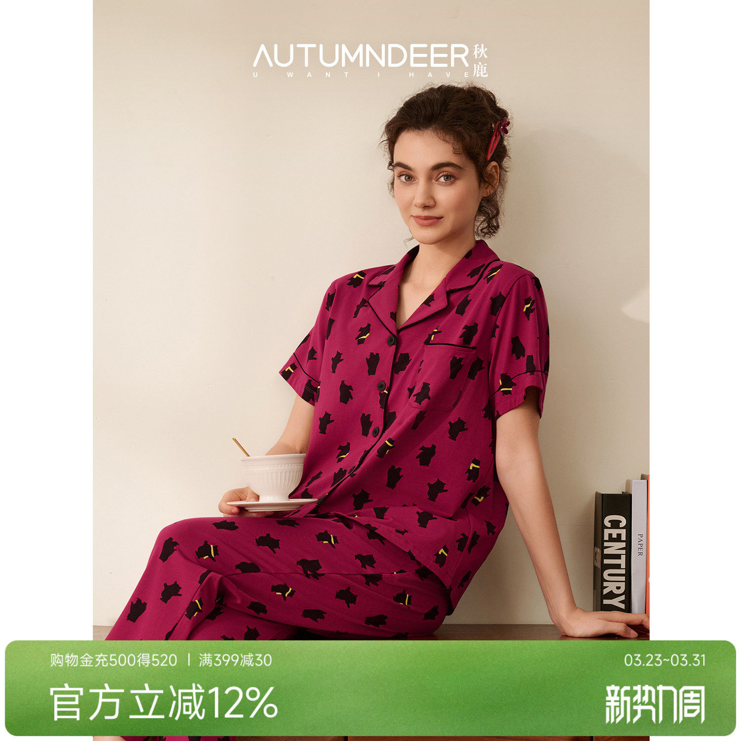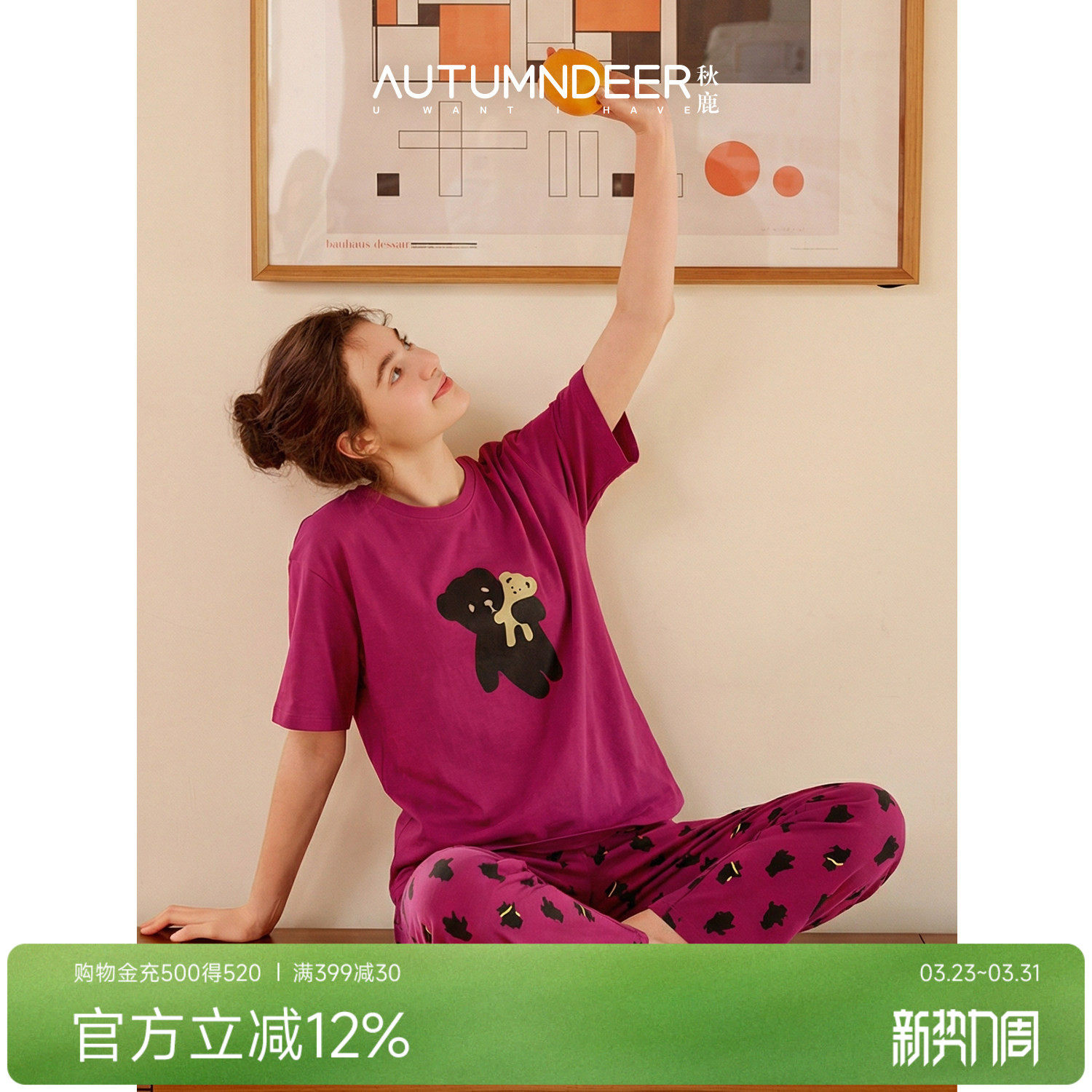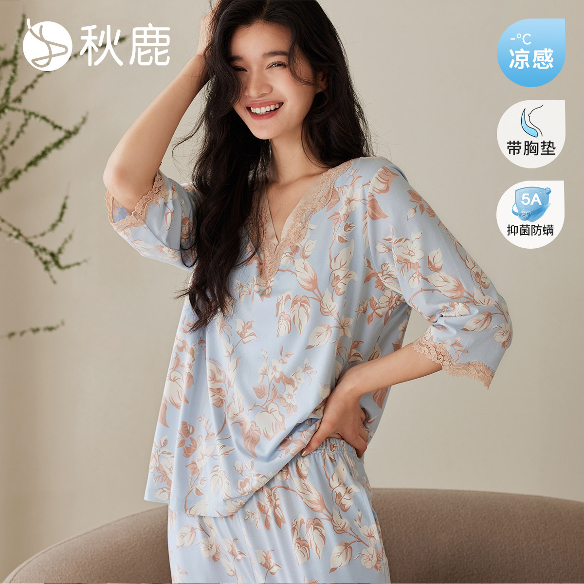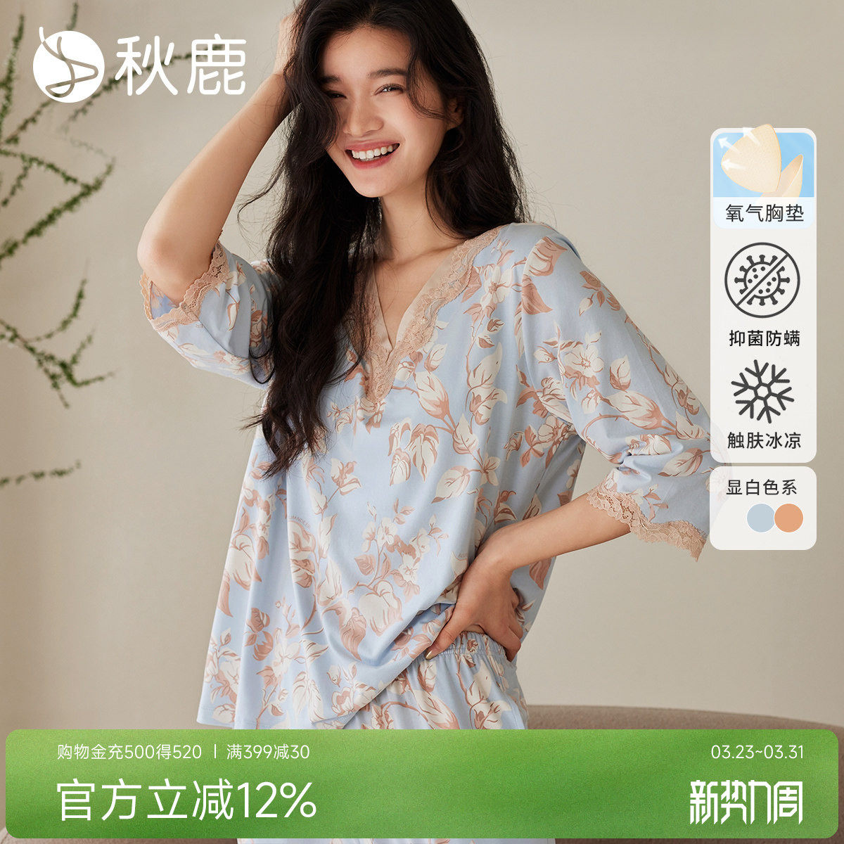 秋鹿【清仓一件79元】短袖睡衣女夏季七分裤家居服套装薄多款可选