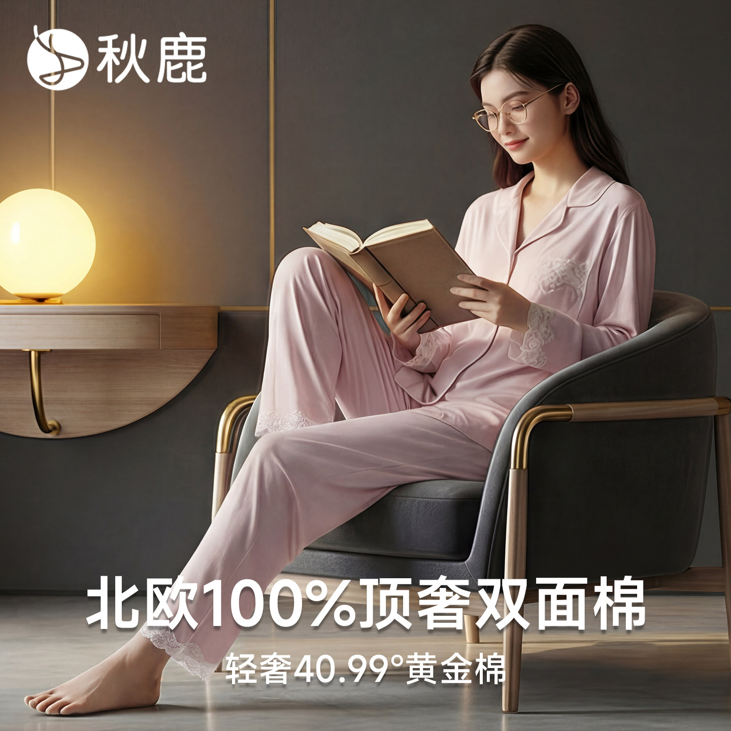 秋鹿100%纯棉女士睡衣可外穿翻领简约轻奢透气家居服套装2026新款