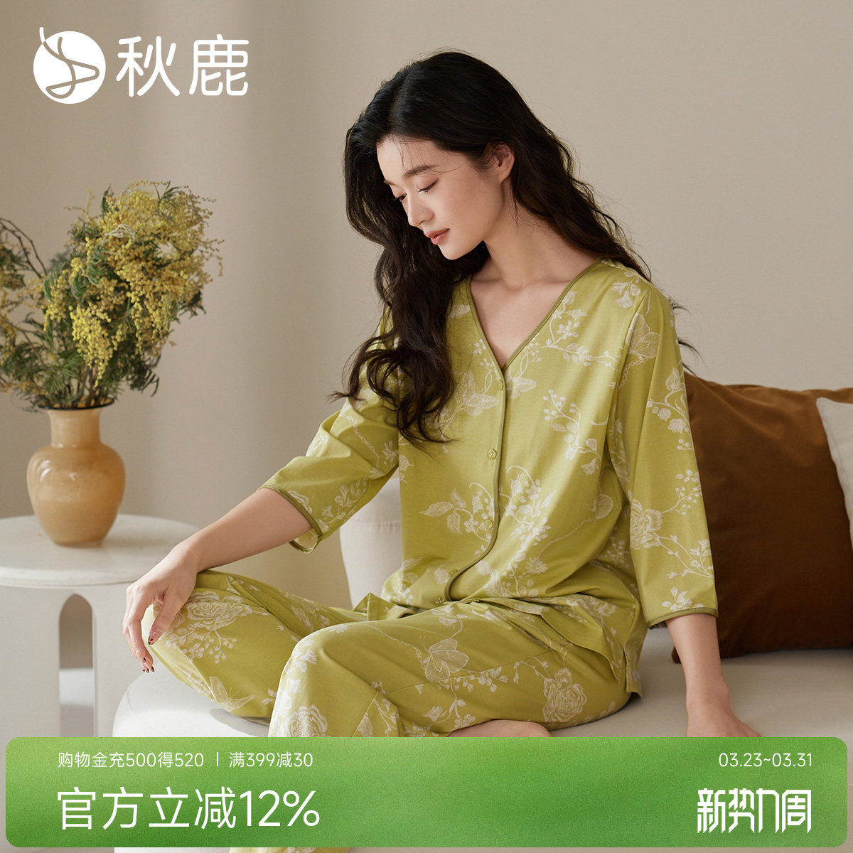 秋鹿100%纯棉睡衣女士对襟V领七分袖九分裤2026春新款家居服套装