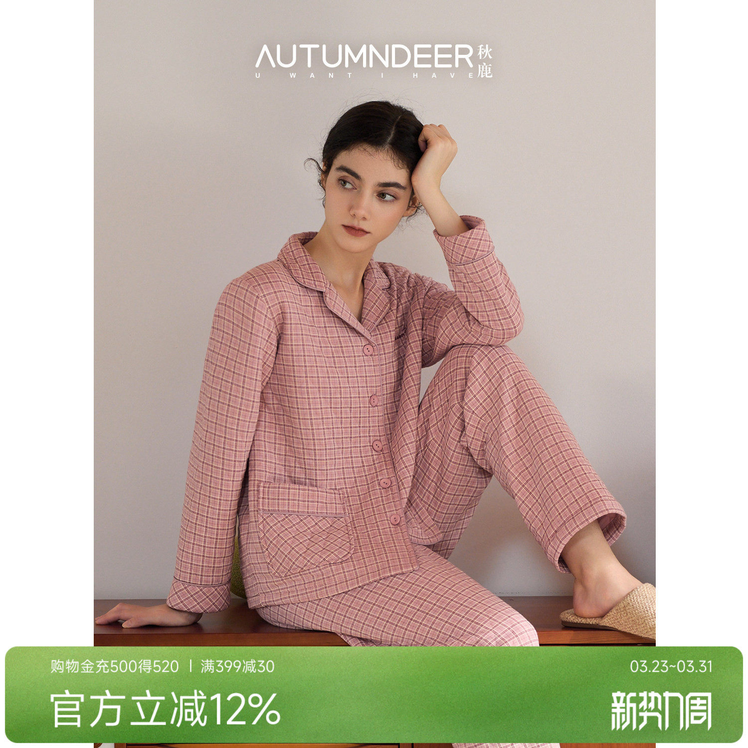 秋鹿纯棉睡衣女士翻领开衫梭织格纹绝美长袖2026春新款家居服套装
