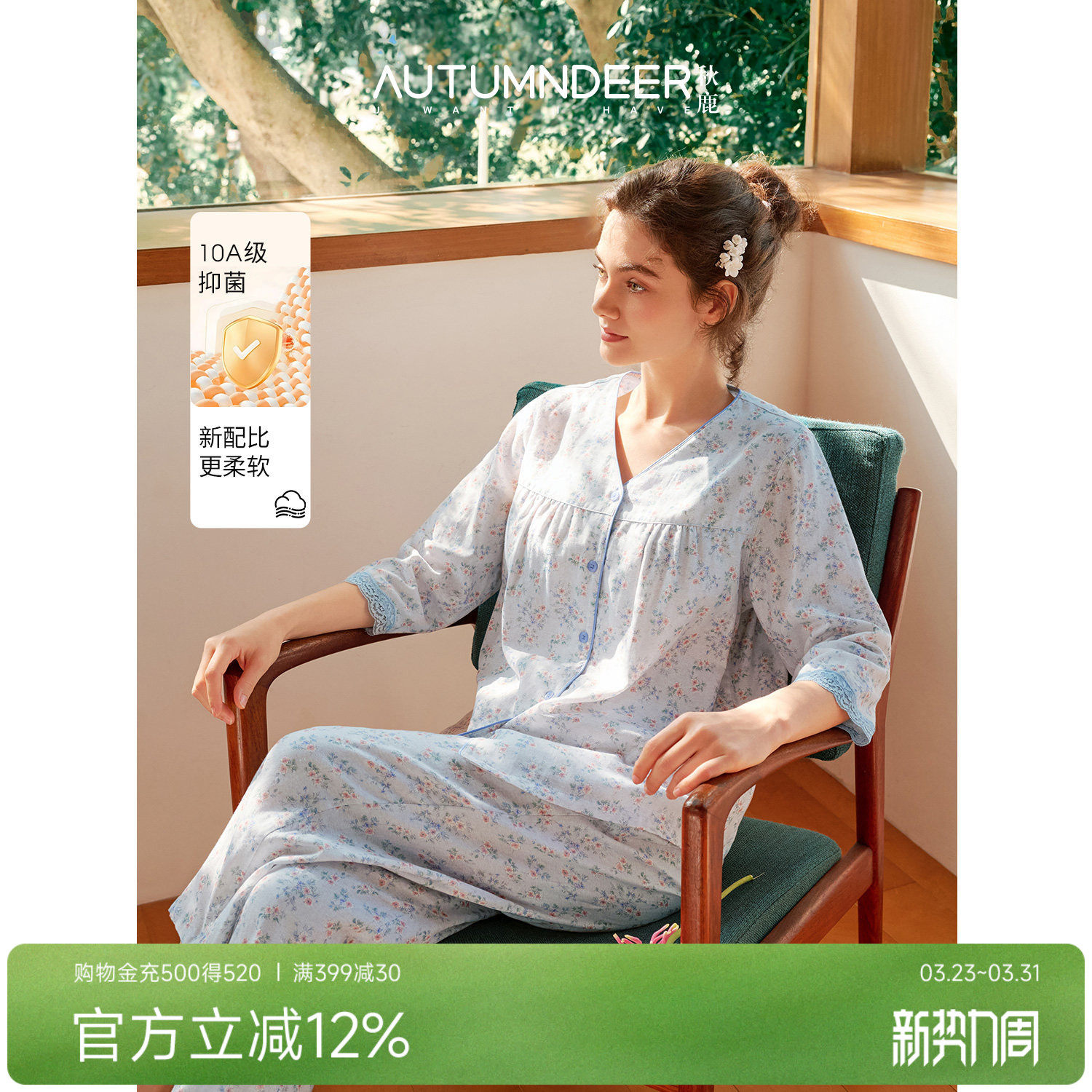 秋鹿纯棉睡衣女士10A抗菌双层纱V领显瘦蕾丝碎花2026春新款家居服