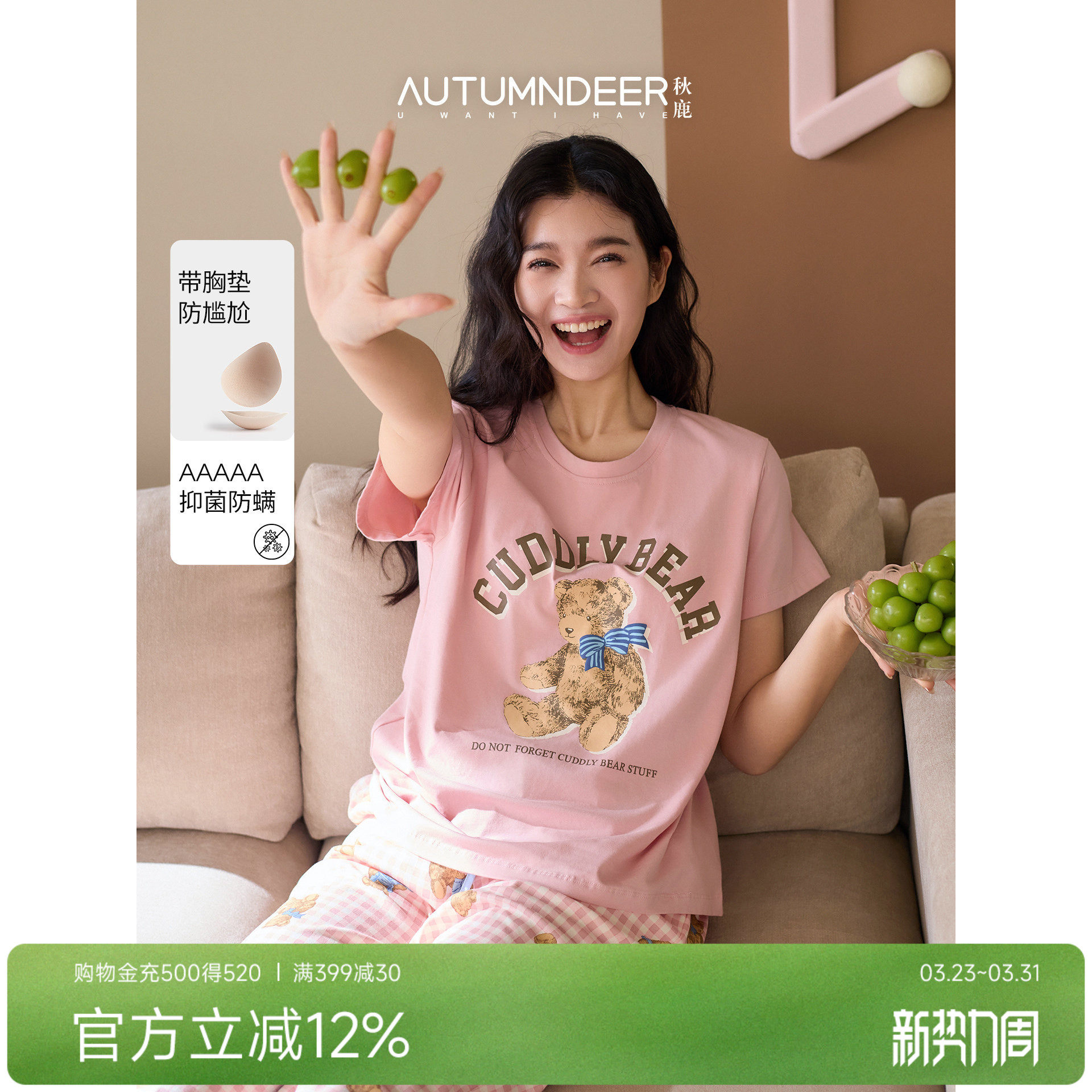 秋鹿带胸垫超柔纯棉抑菌卡通小熊睡衣女士短袖绝美2026新款家居服