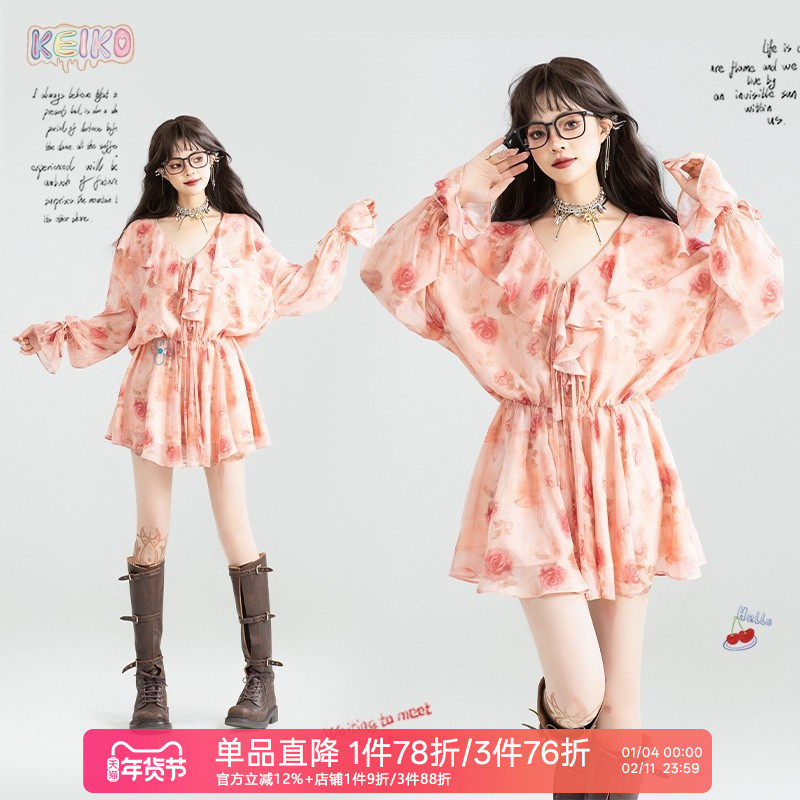 KEIKO 温柔感玫瑰纹碎花连衣裙26春季气质粉色V领收腰仙女雪纺裙