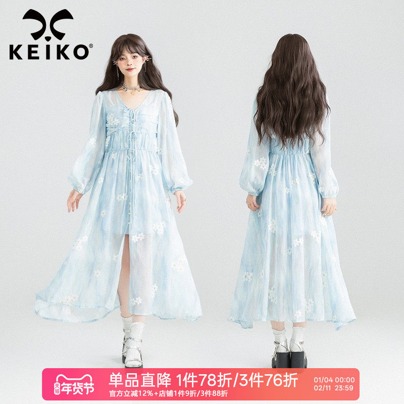 KEIKO [刺绣小碎花] 清雅蓝色雪纺连衣裙25早秋+吊带裙两件套装裙
