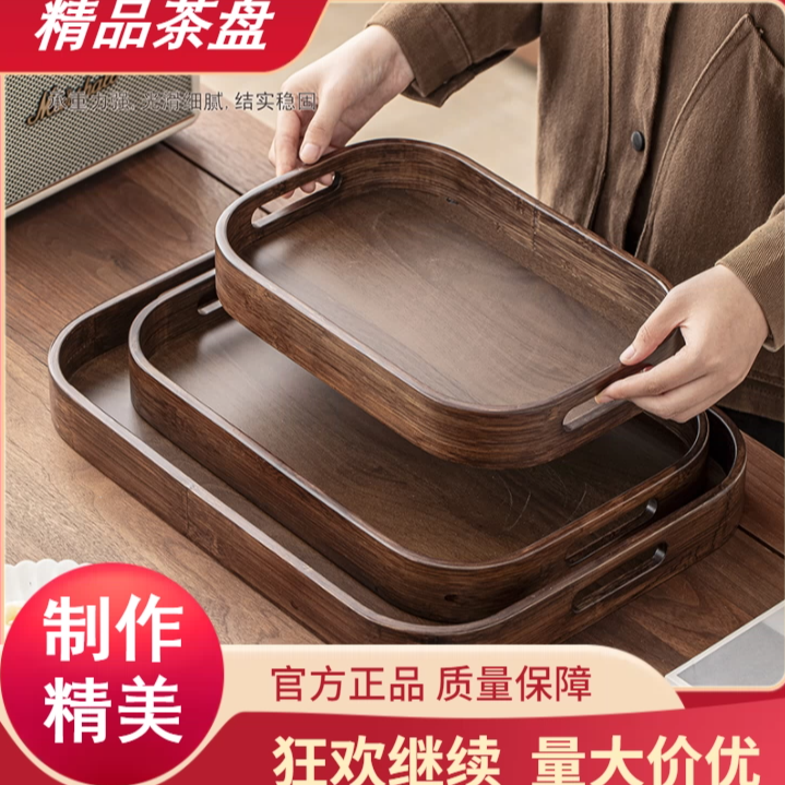 长方形实木托盘黑胡桃木茶盘家用客厅木质餐盘零食干果水杯收纳盘