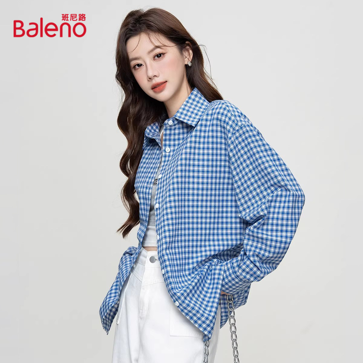 班尼路经典港风翻领蓝色格子衬衫女春秋慵懒休闲衬衣拼接上衣女J