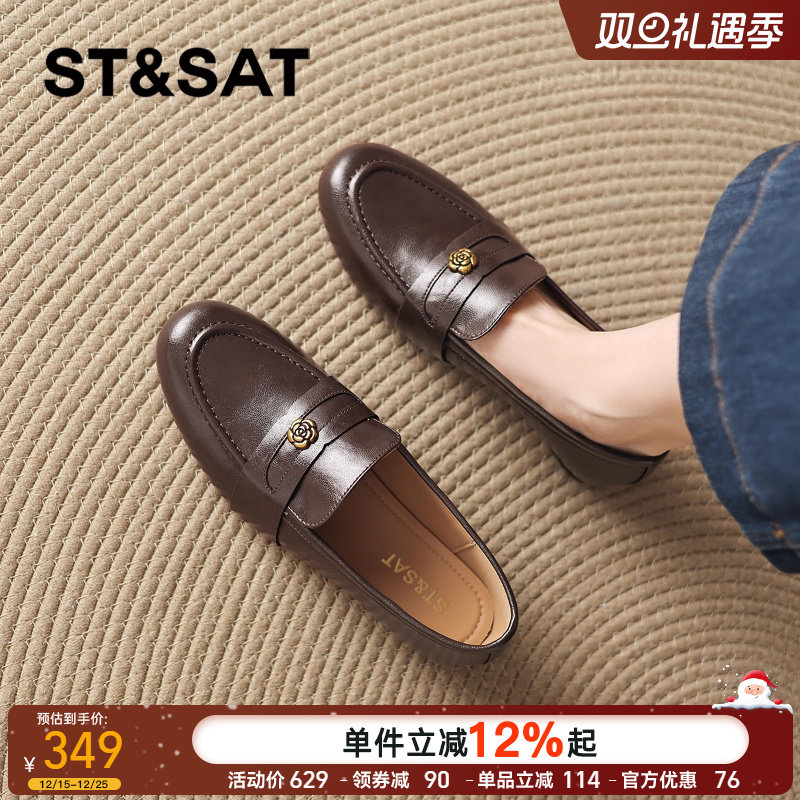 星期六山茶花真皮乐福鞋女2025新款秋季棕色小皮鞋圆头平底单鞋子