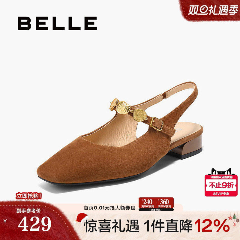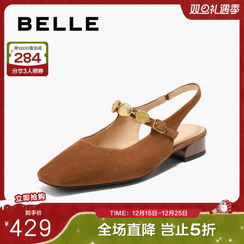 百丽方头包头凉鞋女2025夏季新款玛丽珍浅口平底单鞋子3SS30BH5