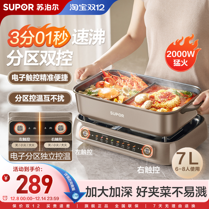 苏泊尔鸳鸯锅电火锅家用新款7L大容量火锅多功能煎烤炒煮一体热锅