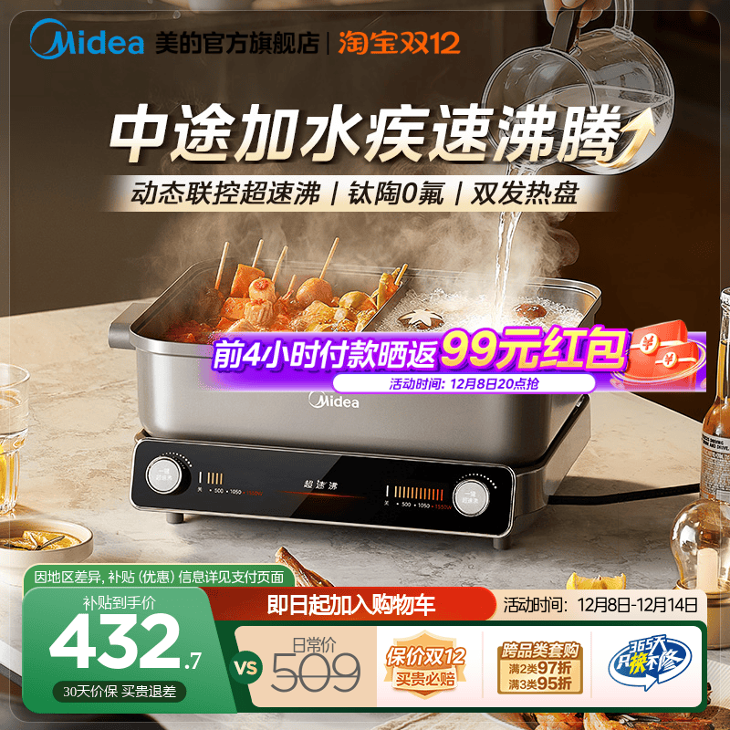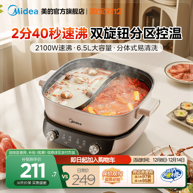 美的速沸电火锅6L大容量鸳鸯锅电煮锅多功能电炒锅[下拉详情优惠]