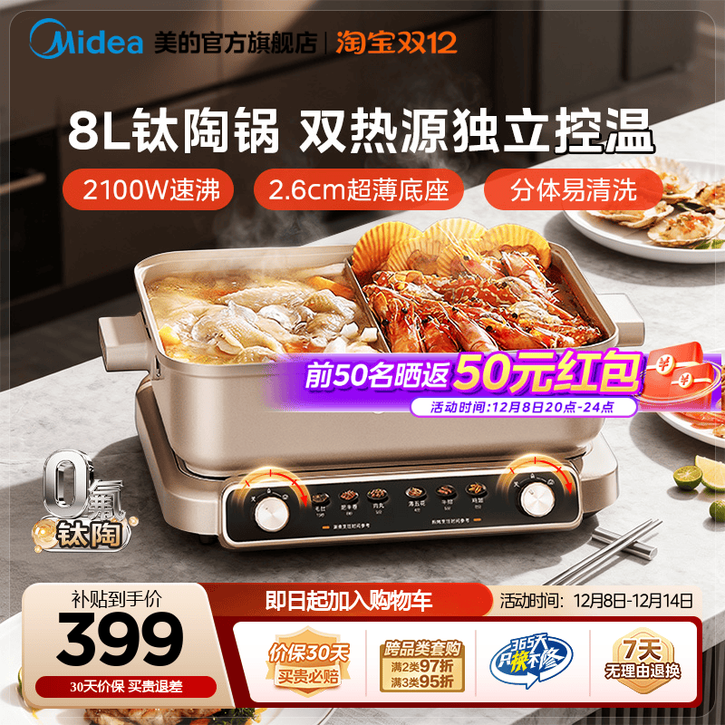 美的速沸电火锅8L大容量家用电煮锅鸳鸯锅分体式多功能煎锅电炒锅