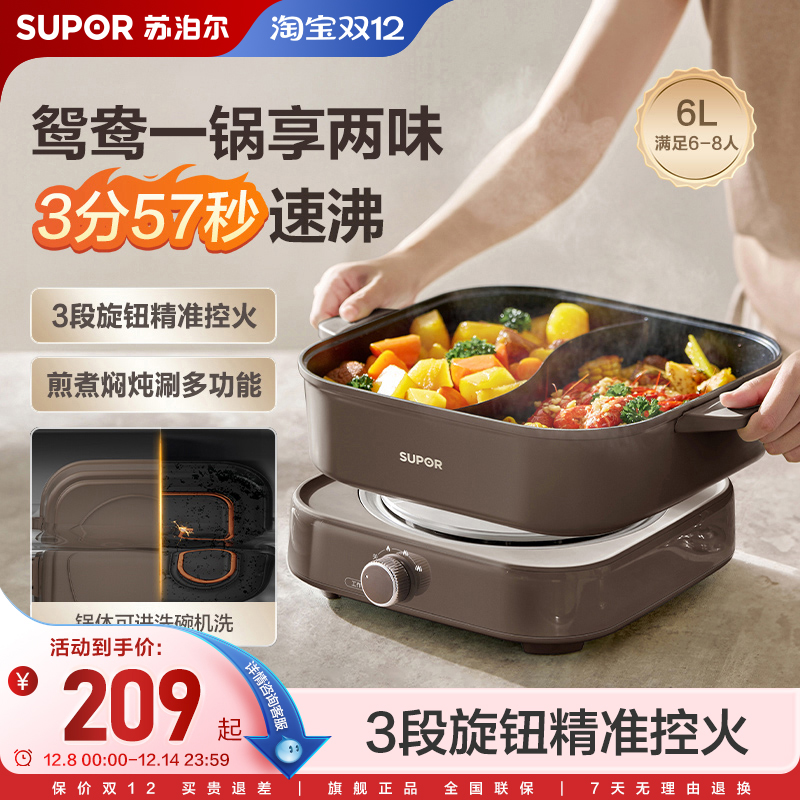 苏泊尔速沸电火锅电锅家用6L大容量电煮火锅鸳鸯分体式电热锅炒锅