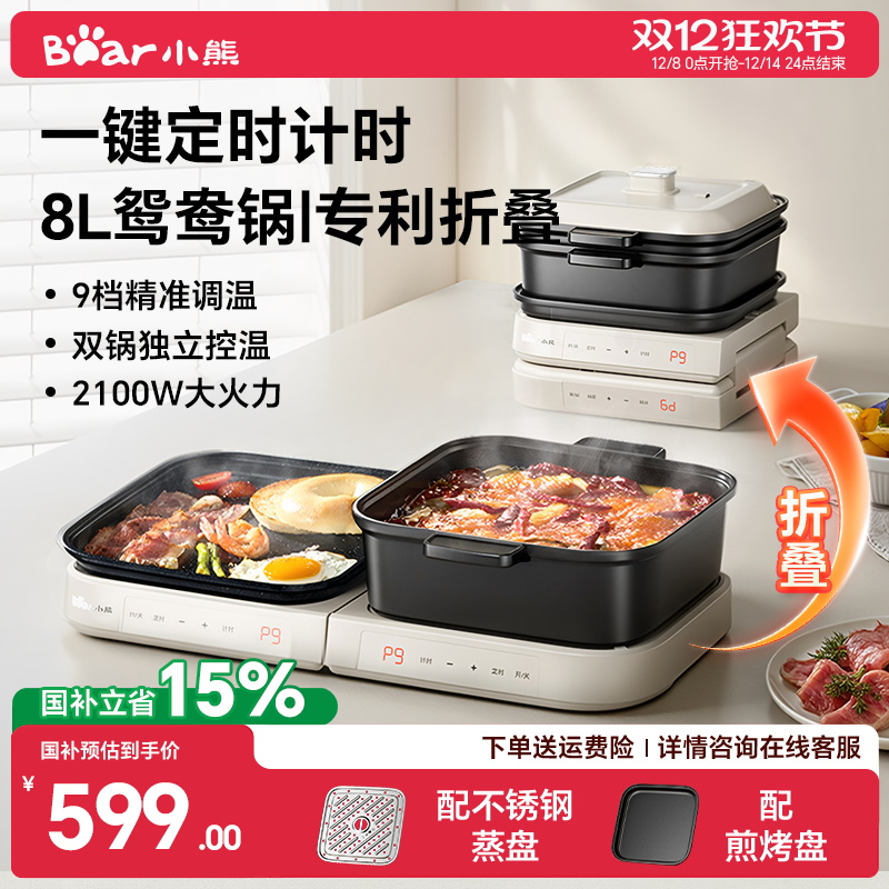 小熊叠叠锅电火锅分体式鸳鸯大容量料理锅家用蒸煮煎烤肉多功能锅