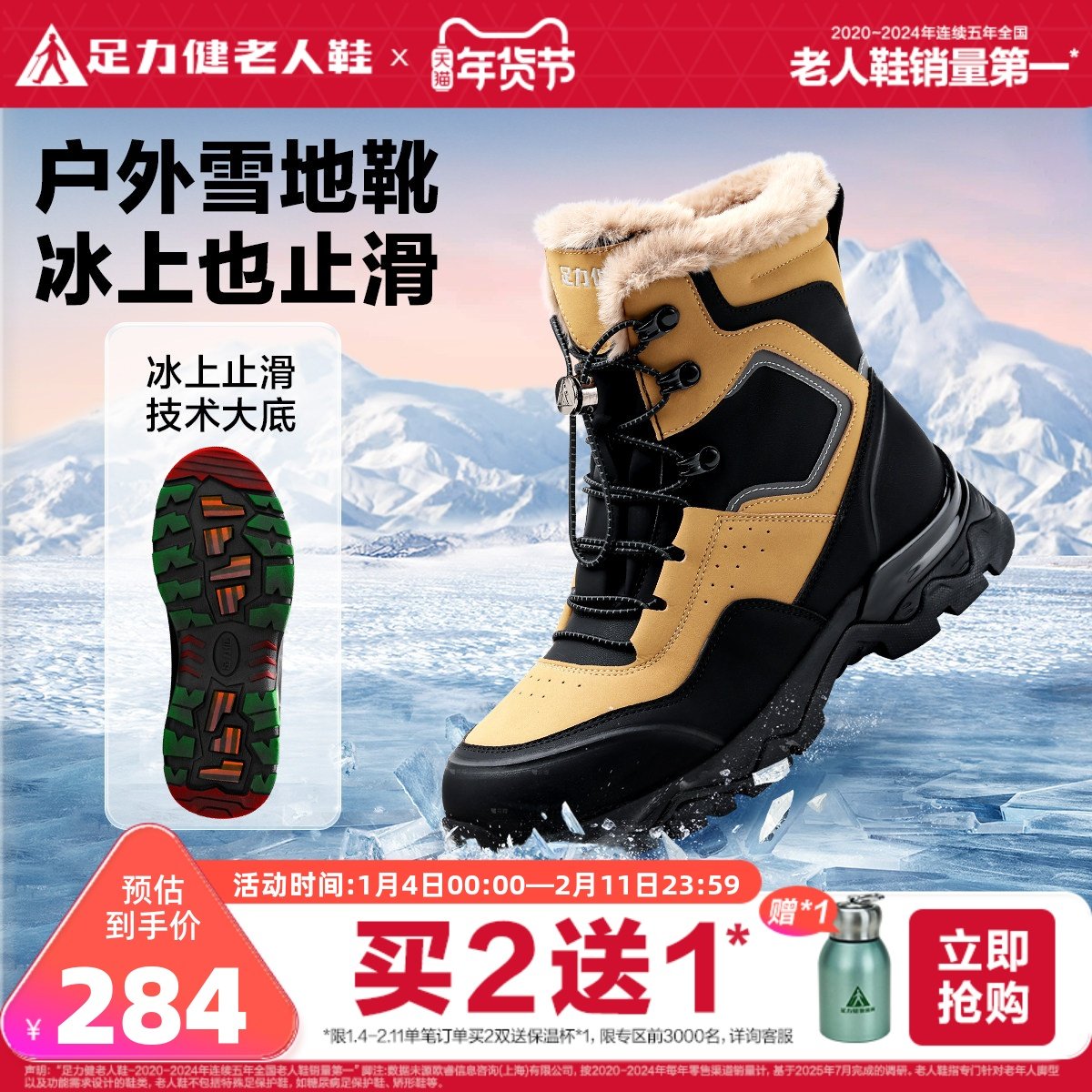 足力健雪地靴老人鞋女鞋冬季加绒保暖棉鞋妈妈鞋舒适轻便厚底靴子