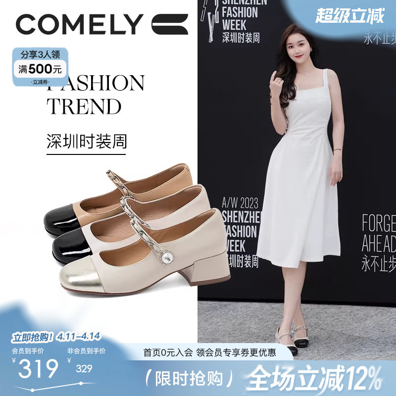 康莉小香风玛丽珍鞋女春季新款圆头真皮粗跟拼接软底舒适高跟单鞋