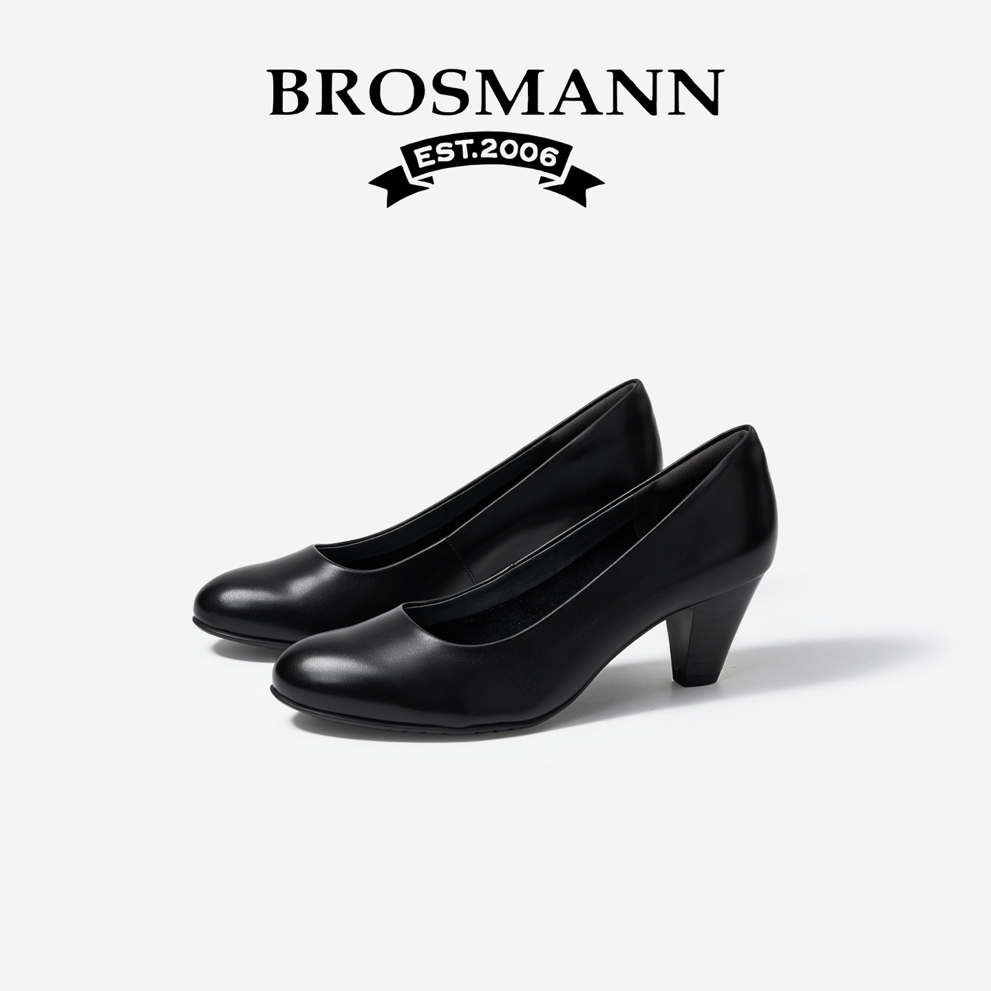 宝舒曼浅口圆头高跟鞋女春季新款黑色单鞋通勤一脚蹬真皮粗跟女鞋