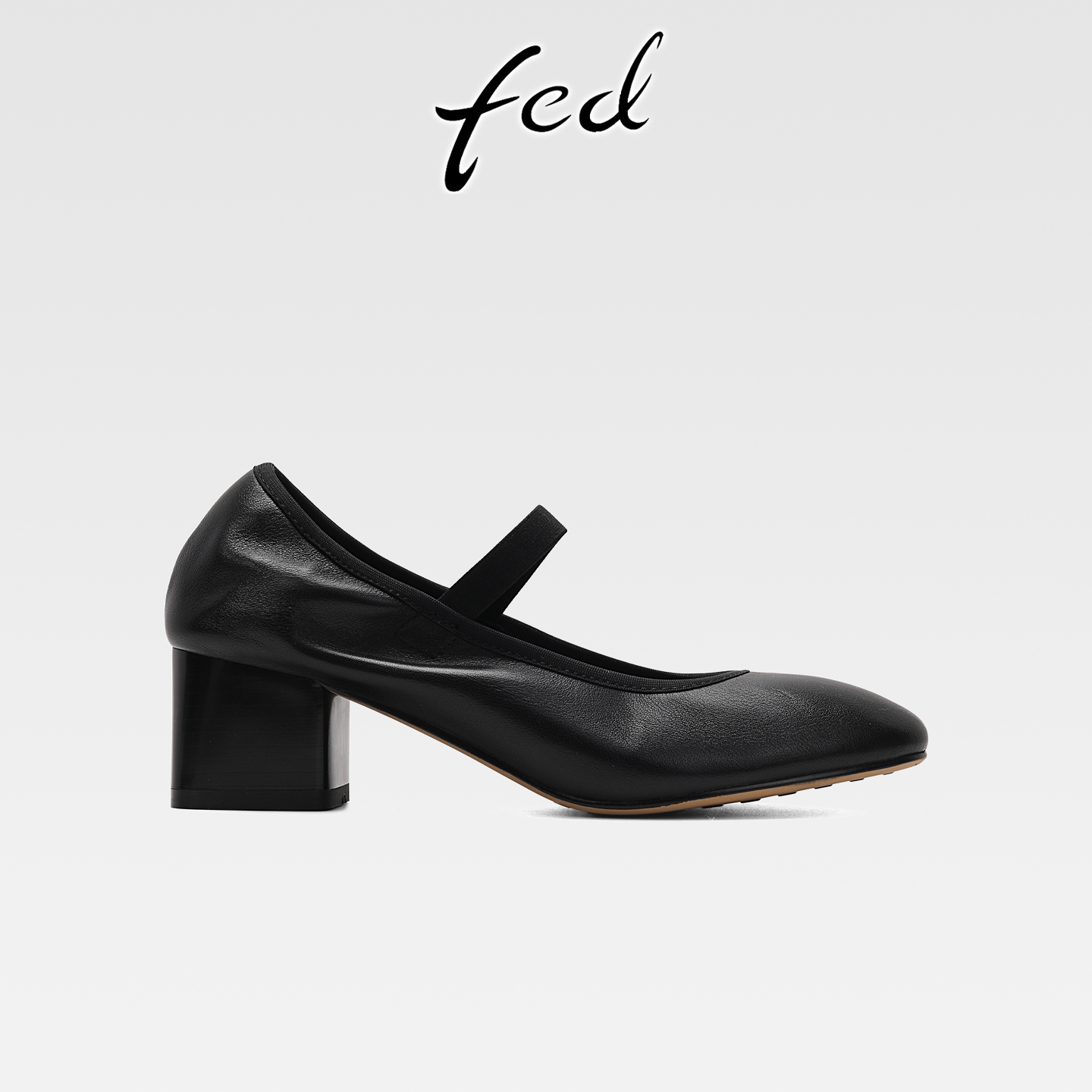 fed法式复古真皮粗跟圆头玛丽珍鞋女一字带气质浅口通勤高跟单鞋