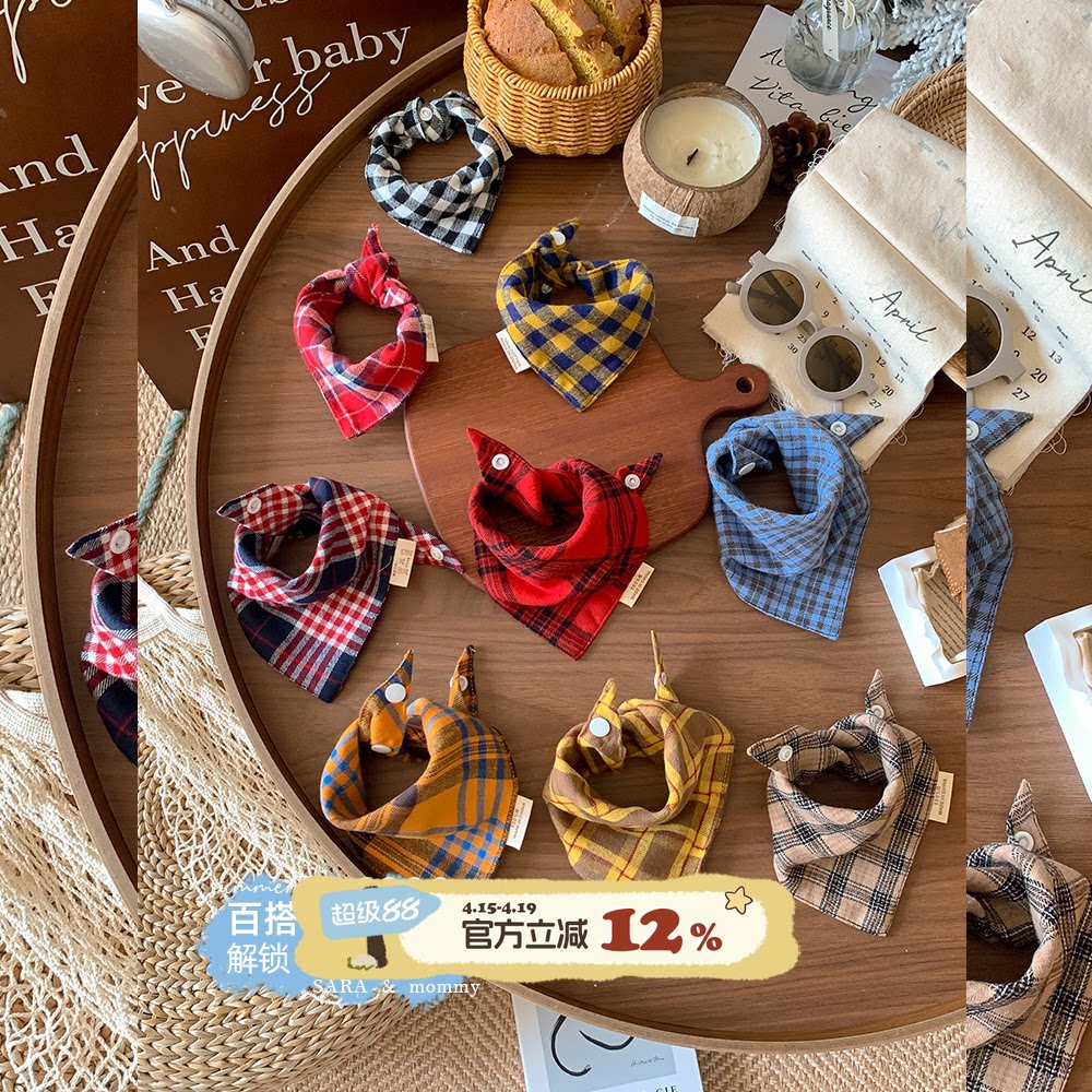 时尚格子三角巾宝宝口水巾婴儿纯棉围嘴春夏男宝女孩新生儿童围巾