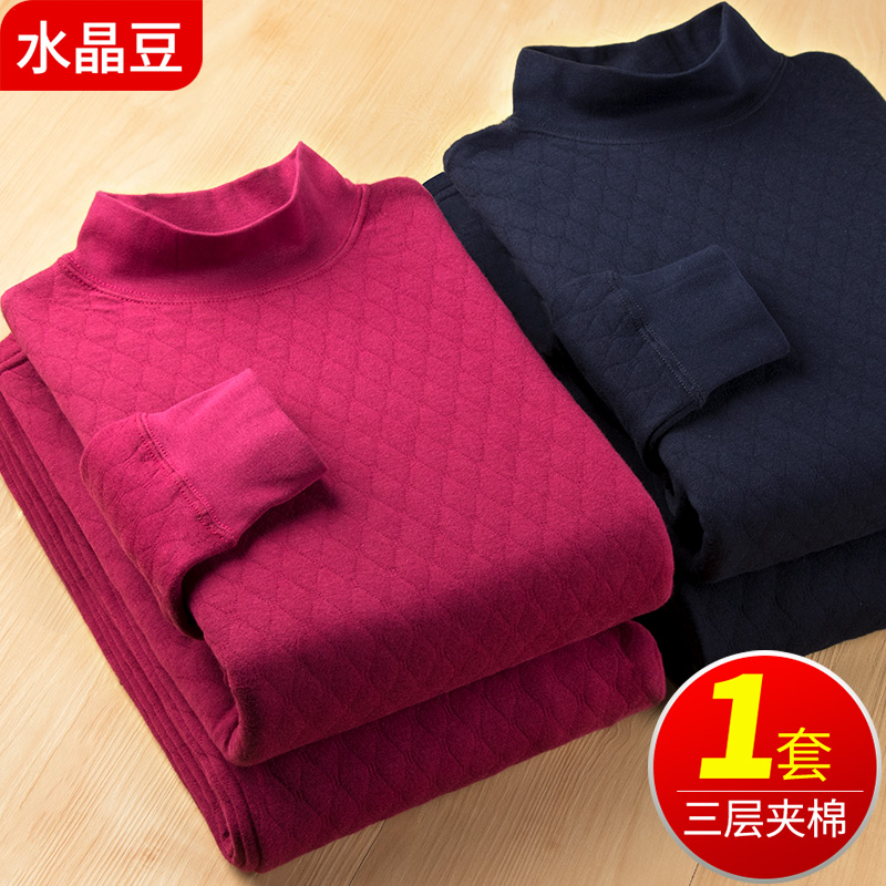 中老年秋衣秋裤加厚纯棉女老人保暖内衣三层夹棉毛衫套装男半高领