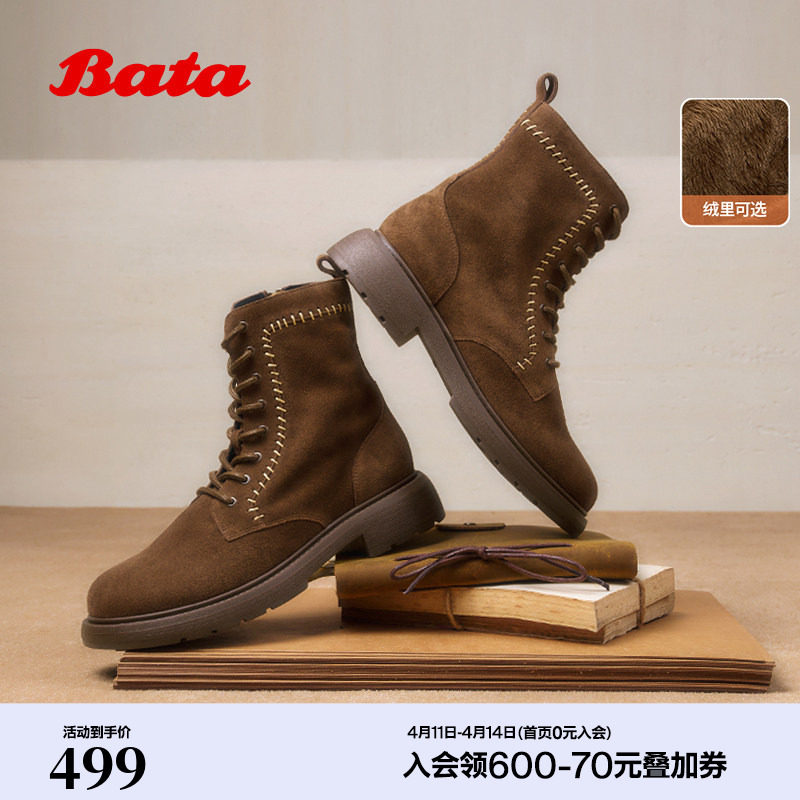 Bata英伦马丁靴女冬新款牛剖皮粗跟绒面百搭短筒靴AD745DD5