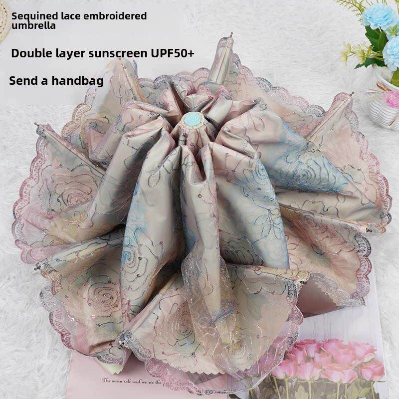 双层刺绣蕾丝伞花边晴雨两用防晒防紫外线黑胶太阳伞女神夏三折伞
