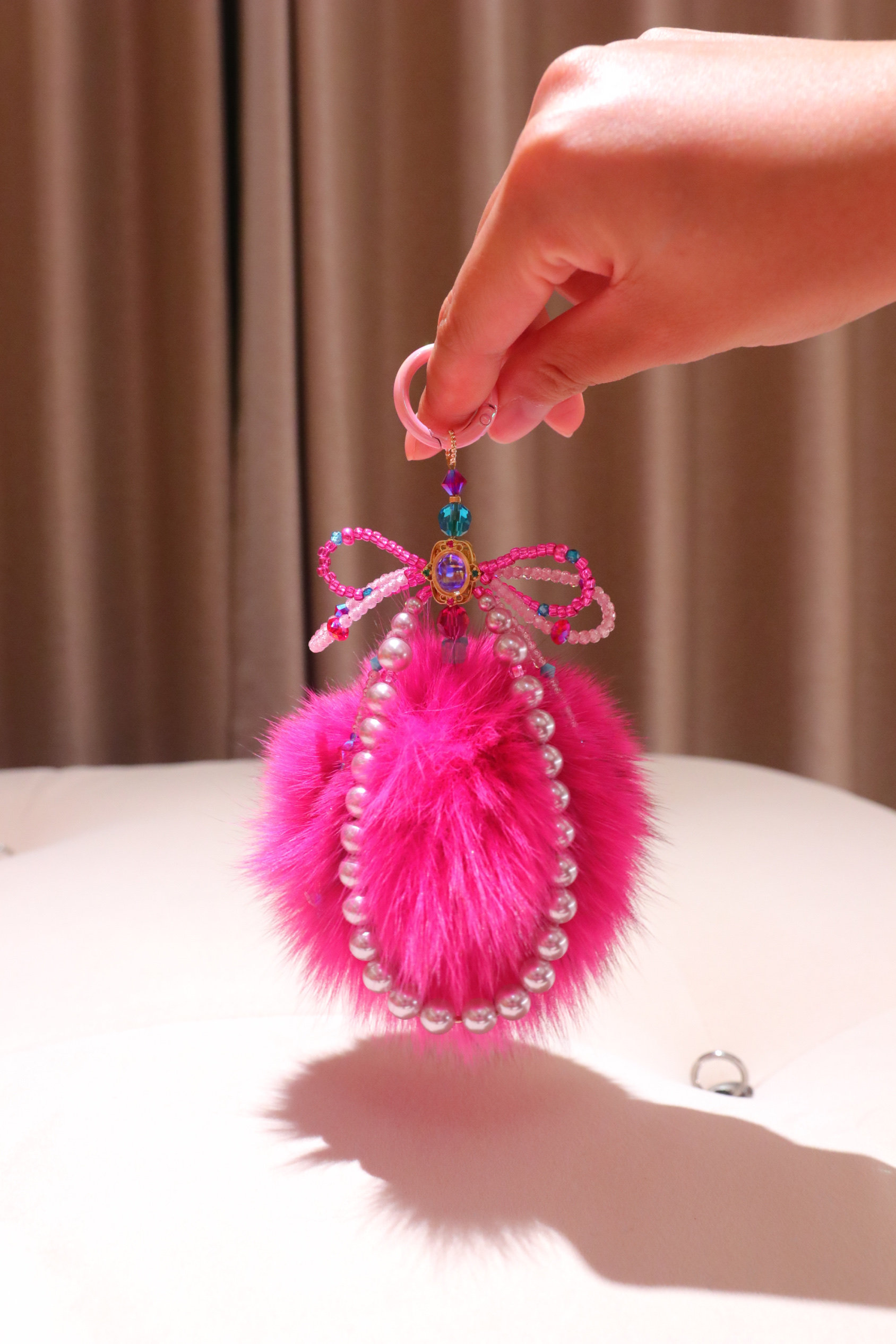 粉红芭比|超大狐狸毛球施家珍珠水晶锆石手机链包挂件可爱少女心
