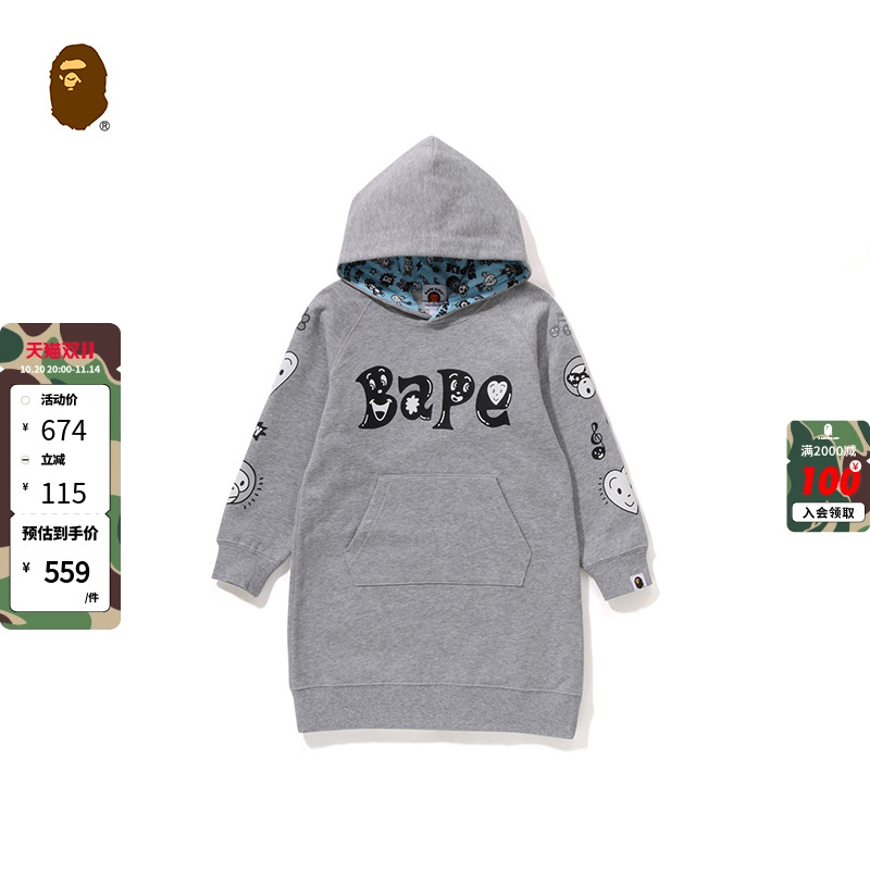 BAPE X CHOCOMOO联名童装秋冬卡通爱心字母连帽长款卫衣裙335901J