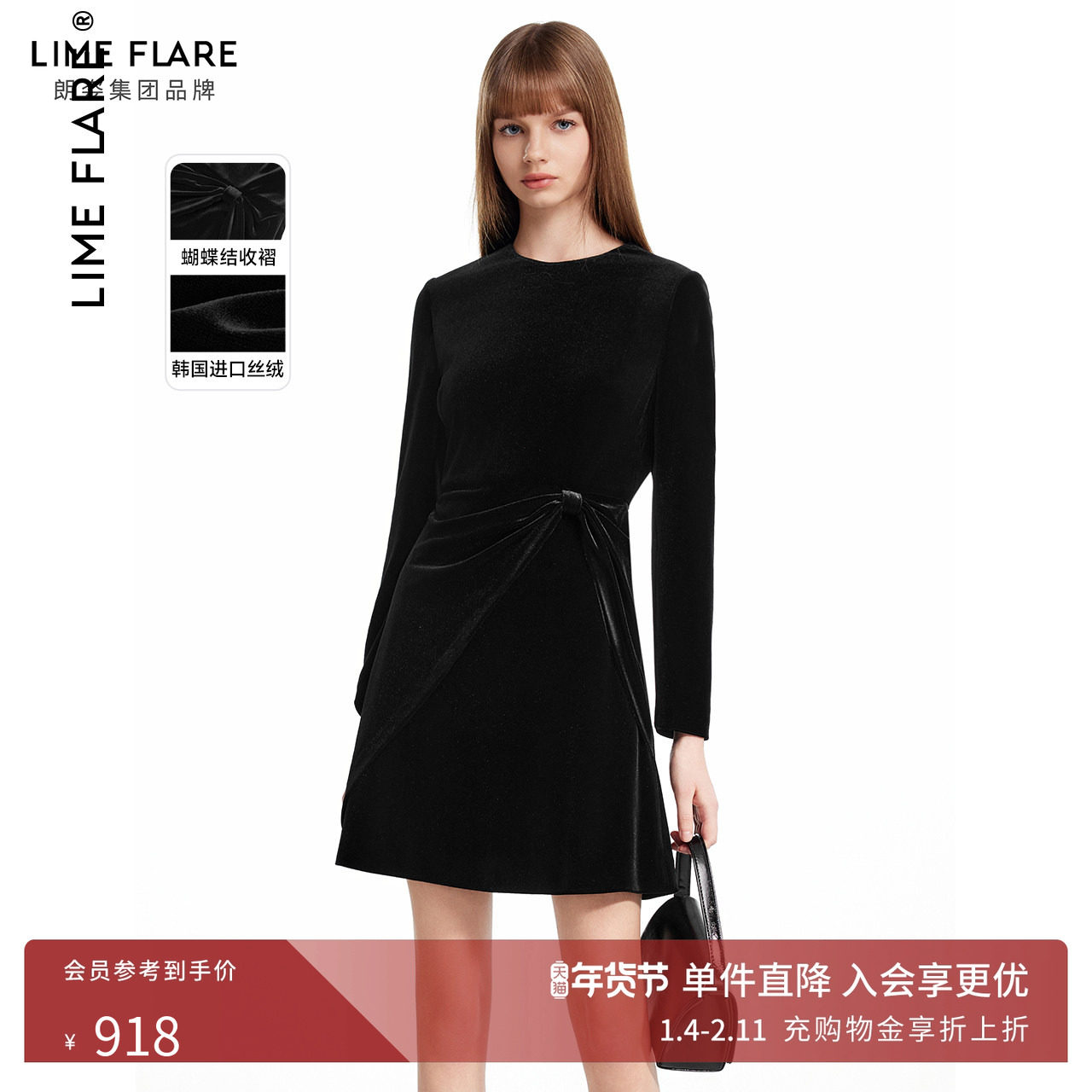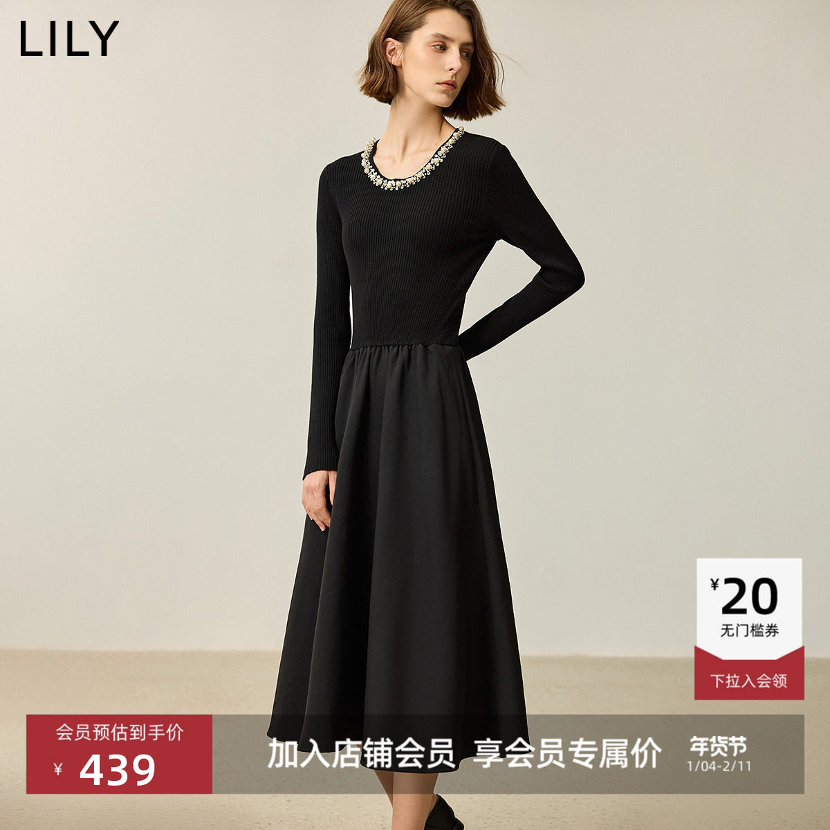 LILY冬新款女装优雅重工钉珠圆领收腰拼接式A字连衣裙小黑裙
