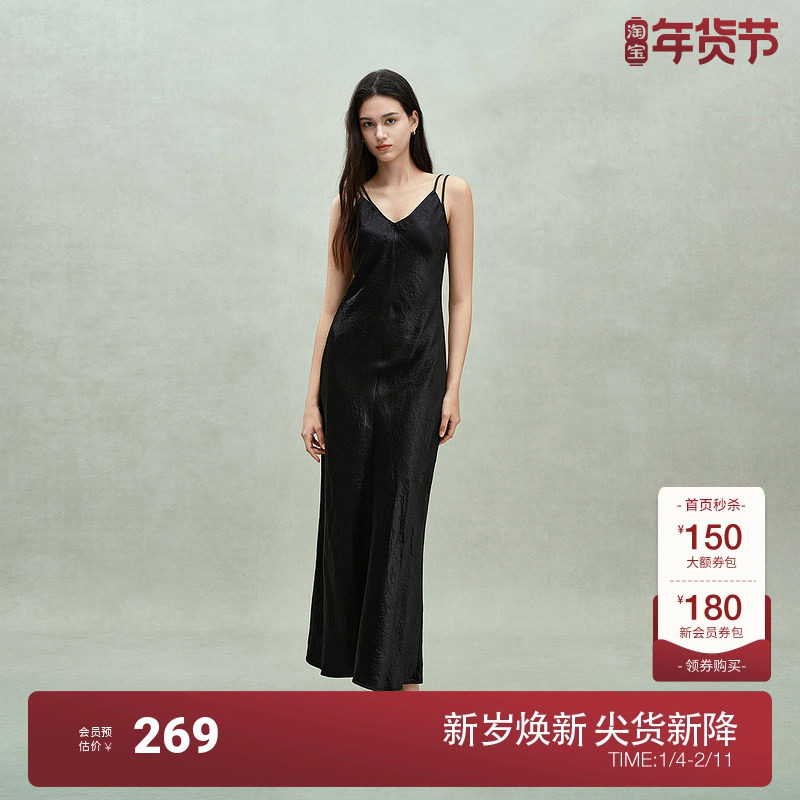 ochirly欧时力 醋酸缎面V领吊带连衣裙A字小黑裙高级2025春季新品