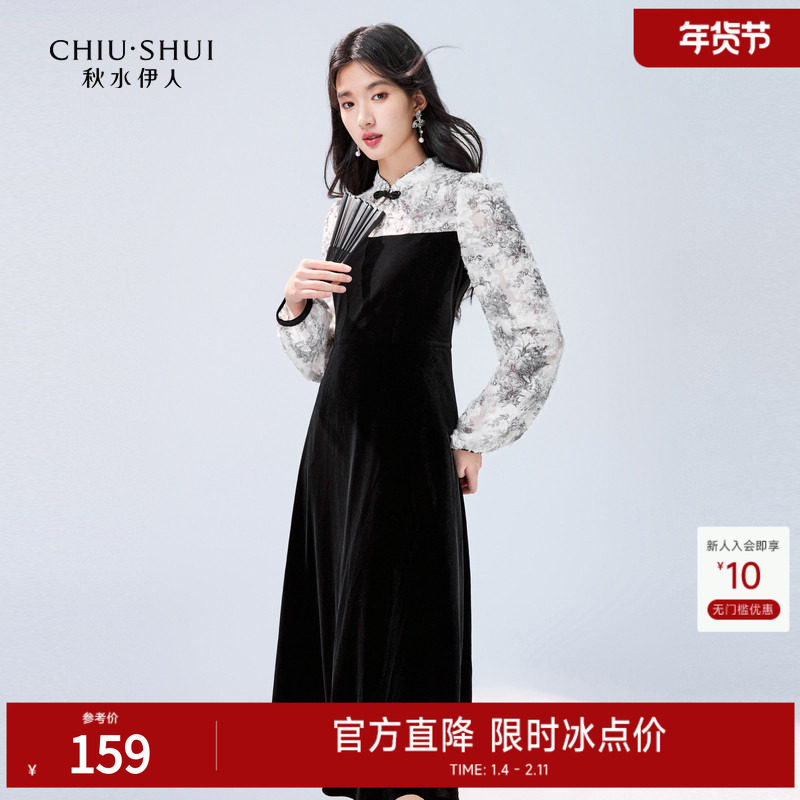 秋水伊人新中式国潮拼接连衣裙2025年冬季新款女装显瘦A字小黑裙