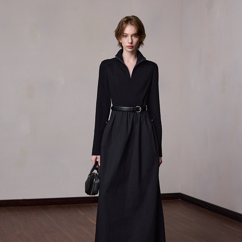 MSLAN轻户外|立领拼接A字小黑裙25秋时髦收腰显瘦连衣裙