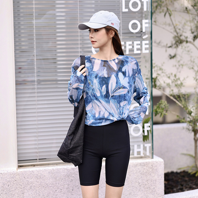 青春运动款泳衣时尚印花长袖罩衫背心短裤分体三件套温泉度假泳装