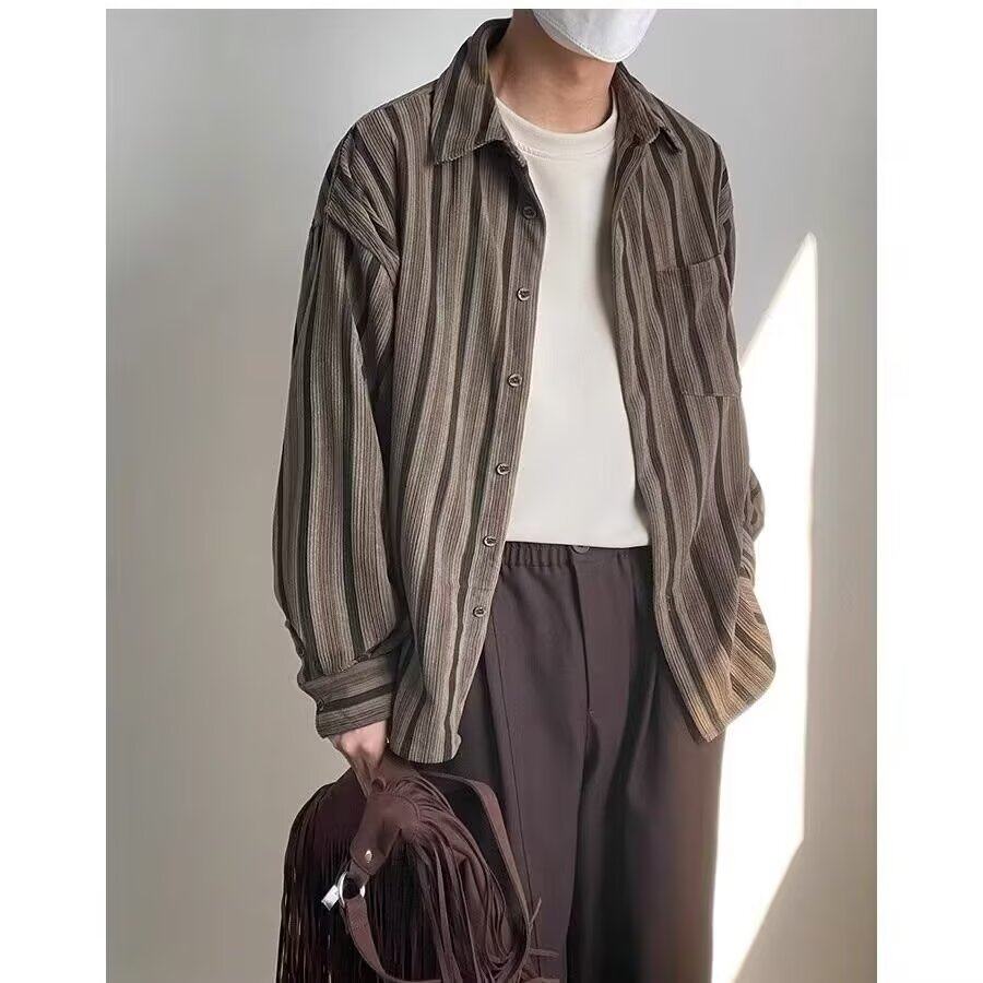 春秋日系复古穿搭整套条纹长袖衬衫男女生宽松百搭学院风衬衣全套