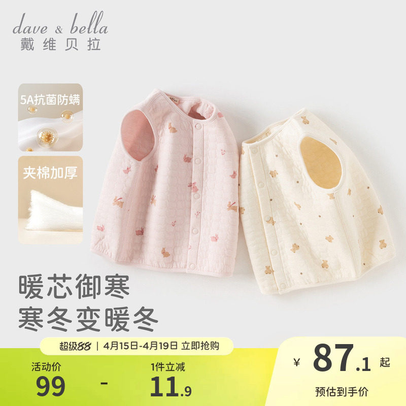 戴维贝拉儿童夹棉背心2026男童新款A类抗菌防螨马甲女童冬季坎肩