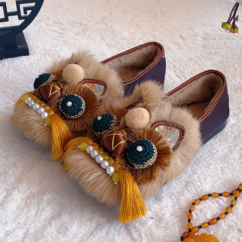 新中式冬季平跟手工虎头棉鞋加绒中国风汉服布鞋软底保暖绣花鞋女