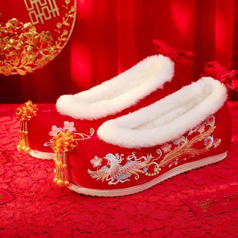 冬季加绒汉服鞋女古装内增高绣花鞋古风翘头中式婚礼新娘秀禾婚鞋