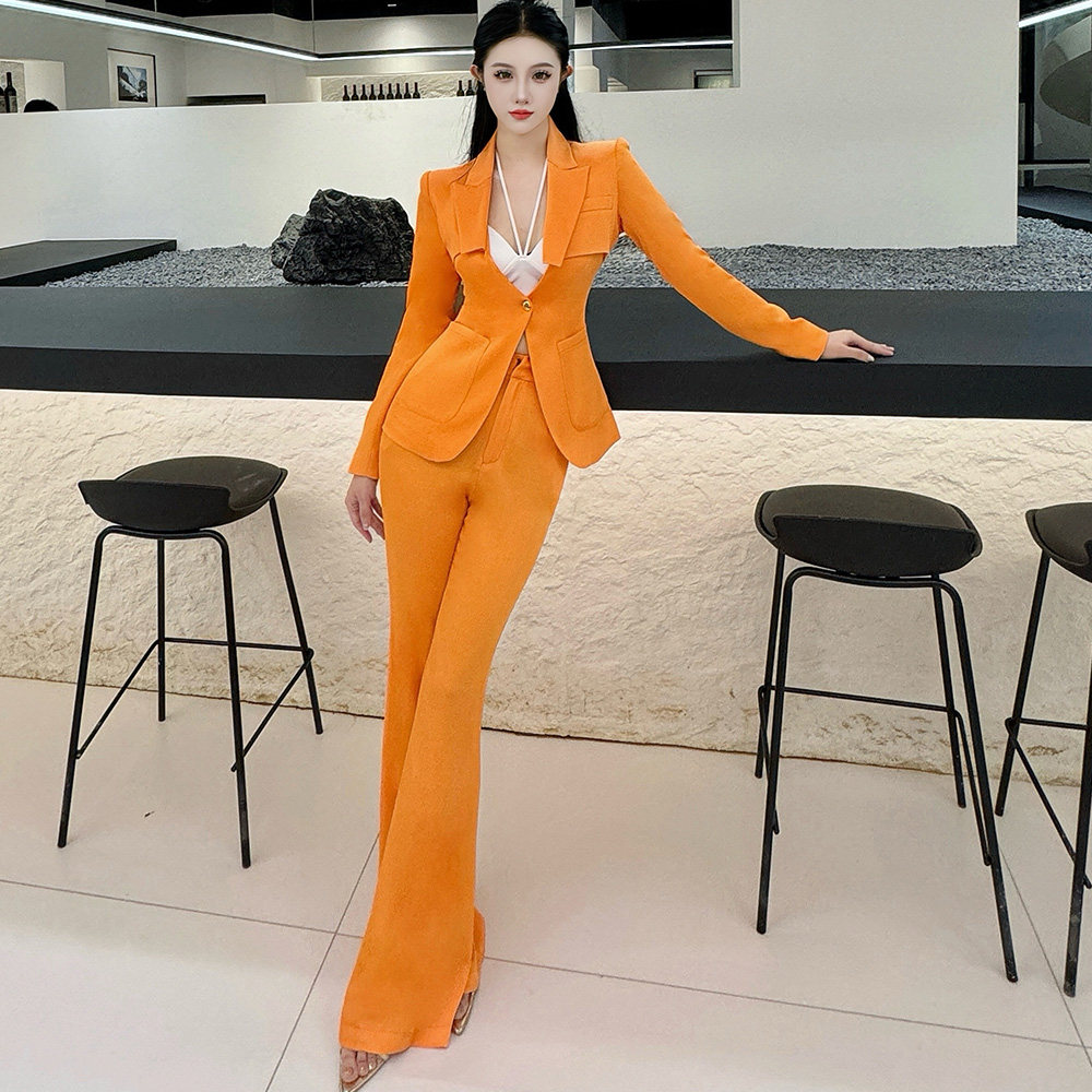 缎面时尚橙色职业装套装女早秋新款显瘦小西装外套微喇叭裤高级感