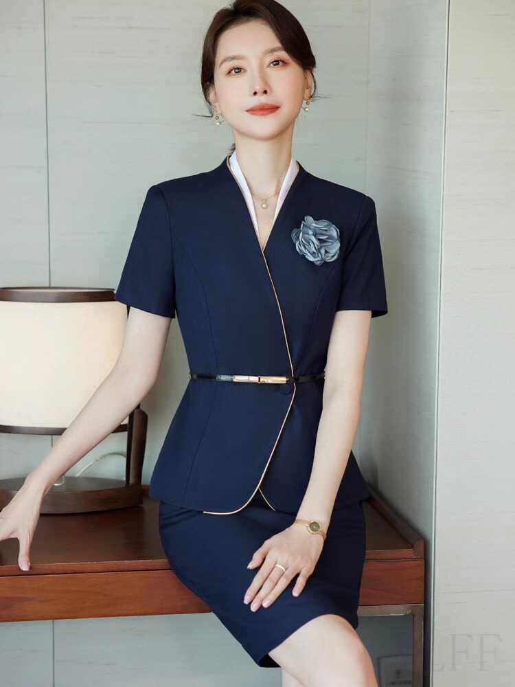 三粒扣夏季职业装套装女薄款短袖西装酒店前台美容珠宝店工作服女