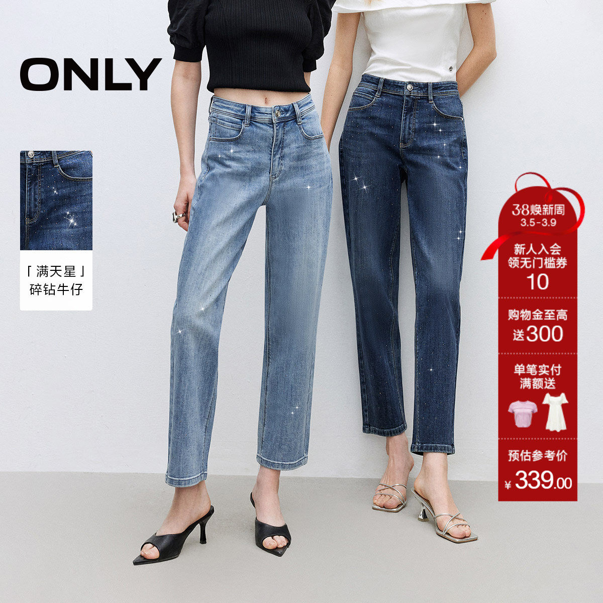 ONLY2026春季新款小个子高腰显瘦烫钻直筒裤九分裤牛仔裤女