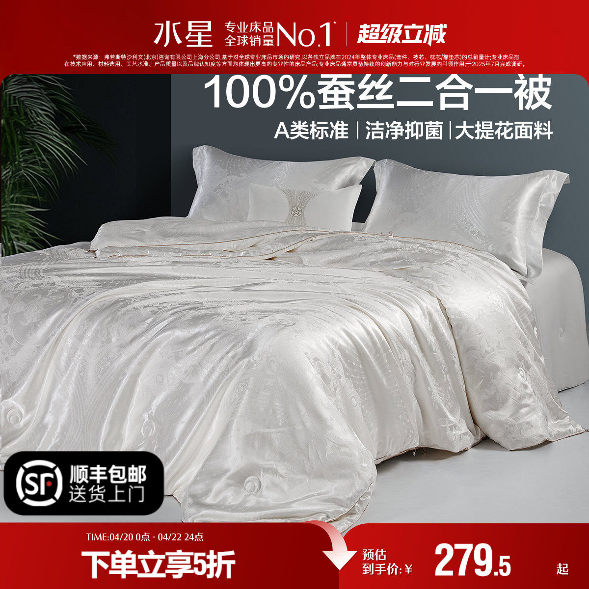水星家纺100%桑蚕丝被春秋被抗菌四季被二合一婚庆被子母被冬被