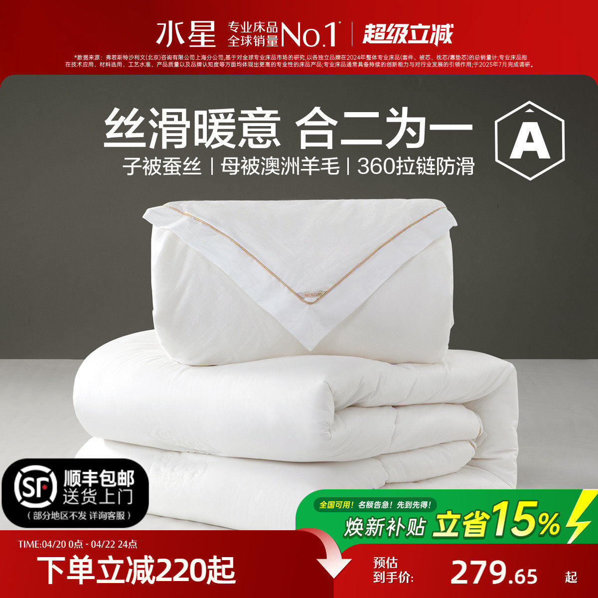 水星家纺抗菌蚕丝澳洲羊毛二合一保暖被芯单双人子母被子家用床品