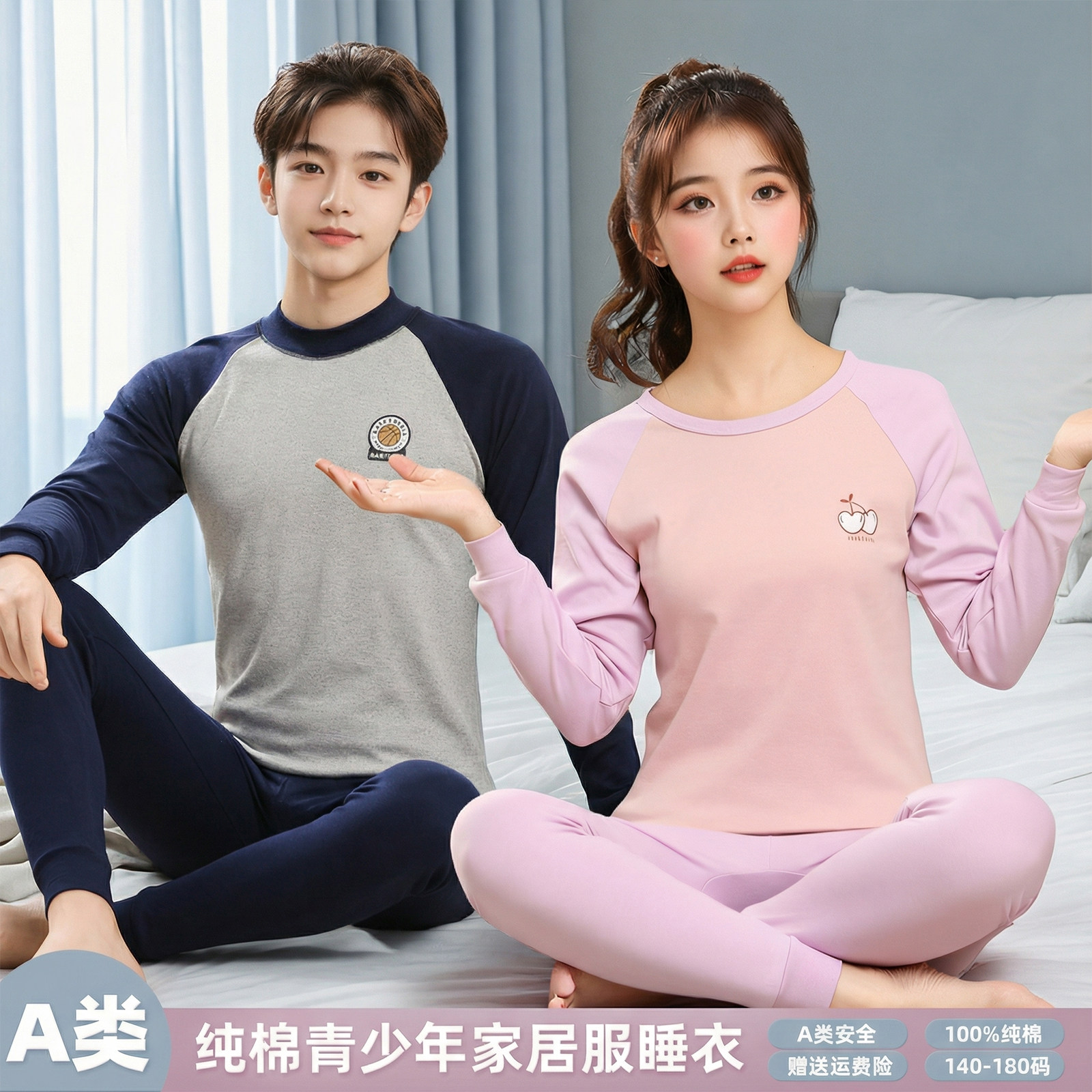 A类纯棉青少年内衣套装 春秋款秋衣秋裤 男女童长袖家居服 100%棉