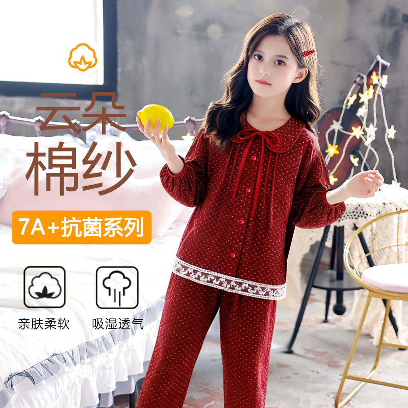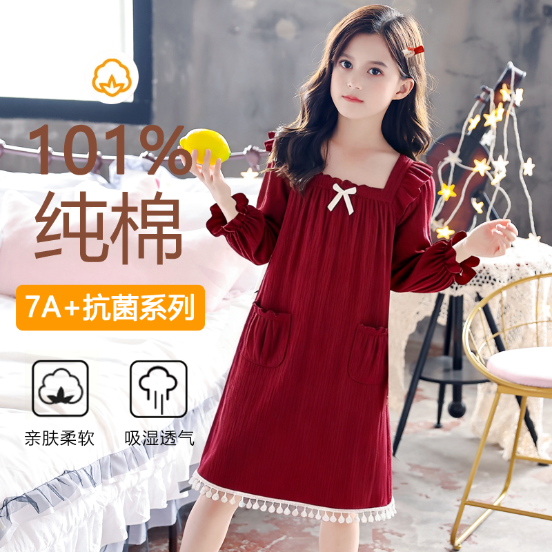 女童睡衣春秋款式纯棉红色长袖睡裙套装秋冬季本命年家居服可外穿